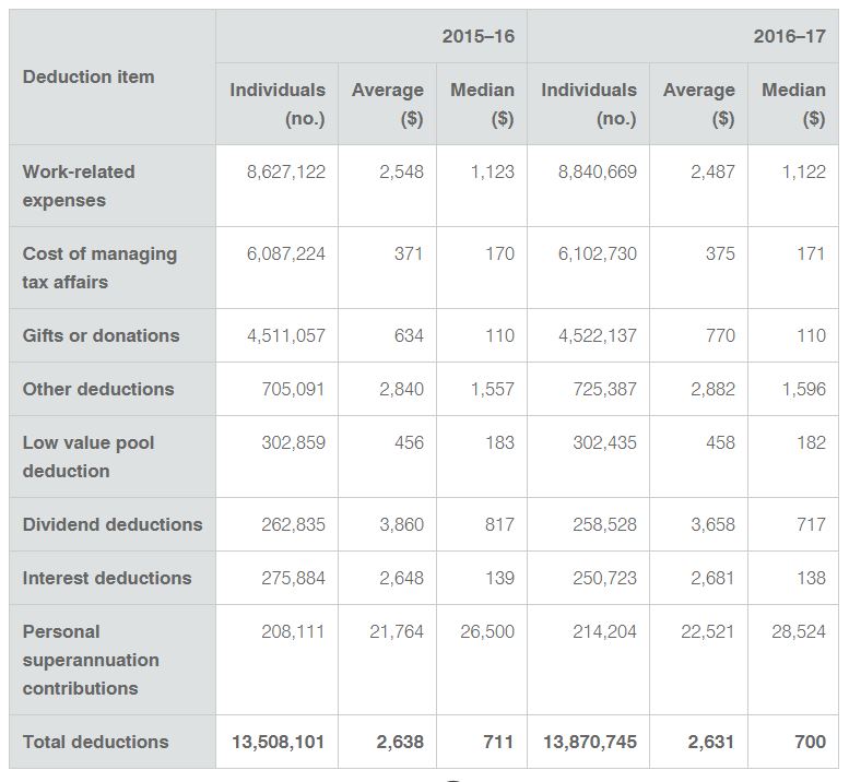 그래도 좀 궁금했다. 대체 다른 사람들은 세금정산시에 어떤 항목을, 얼마만큼 deduction으로 클레임 하며, 어느 정도가 되어야 deduction 금액이 평균보다 많은 것인지 말이다. 세금 문제로 ATO와 엮이고 싶지 않은 나는... 좀 찾아보기로 했다. 오늘 간단히 검색을 하니까, 친절하게 ATO 웹페이지에 2016-2017년 회계년도의 통계자료들이 나와있다. 내 나름대로 (=나한테 쓸모 있는 정보들만) 요약을 해보았다.