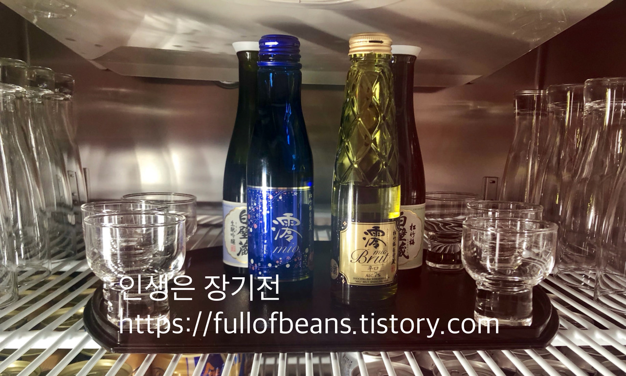 맥주 잔을 얹고 버튼을 누르면 맥주 잔을 자동으로 기울여서 맥주를 따라주는 기계가 있었는데 기계로도 맥주를 심혈을 기울여 따라주는구나 싶었다. 사케의 나라답게 - 차가운 잔들과 함께 각종 사케들이 냉장고에 구비되어있었다.