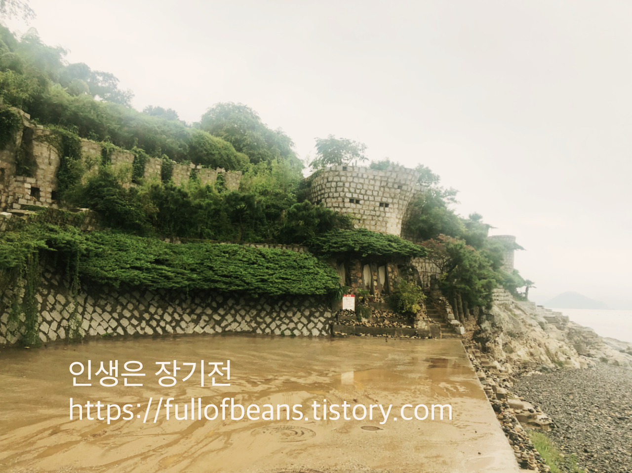 뉴시스에서 가져온 사진은 날씨가 좋은 날 찍은 사진이라 화창해 보이는데 - 우리가 간 날은 하루 종일 비가 온 날이라... 우중충...하다. 태풍으로부터 농작물을 보호해보겠다는 마음으로 한 사람이 시작한 일이 이렇게 성벽의 모습을 띄게 되었고 지금은 거제도의 명물로 자리 잡았다는 게 신기하고 대단해 보였다. 매미성 앞에는 몽돌이 쌓인 작은 해변이 있다.
