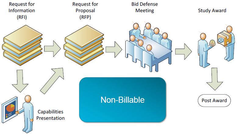 우선 CRO 선정을 하기 위해서는 일단 임상연구에 대한 대략적인 컨셉 & 기본 계획들을 가지고 RFI를 작성해서 마음에 두고 있는 CRO들에 보내고 RFP를 요청한다. 그리고는 1차 스크리능을 거친 후 bid defense meeting을 통해 최종 CRO 선정을 완료한다. CRO 측에서는 이때 BD 팀이 꾸려지고, 이때 하는 일은 모두 non-billable 하다...