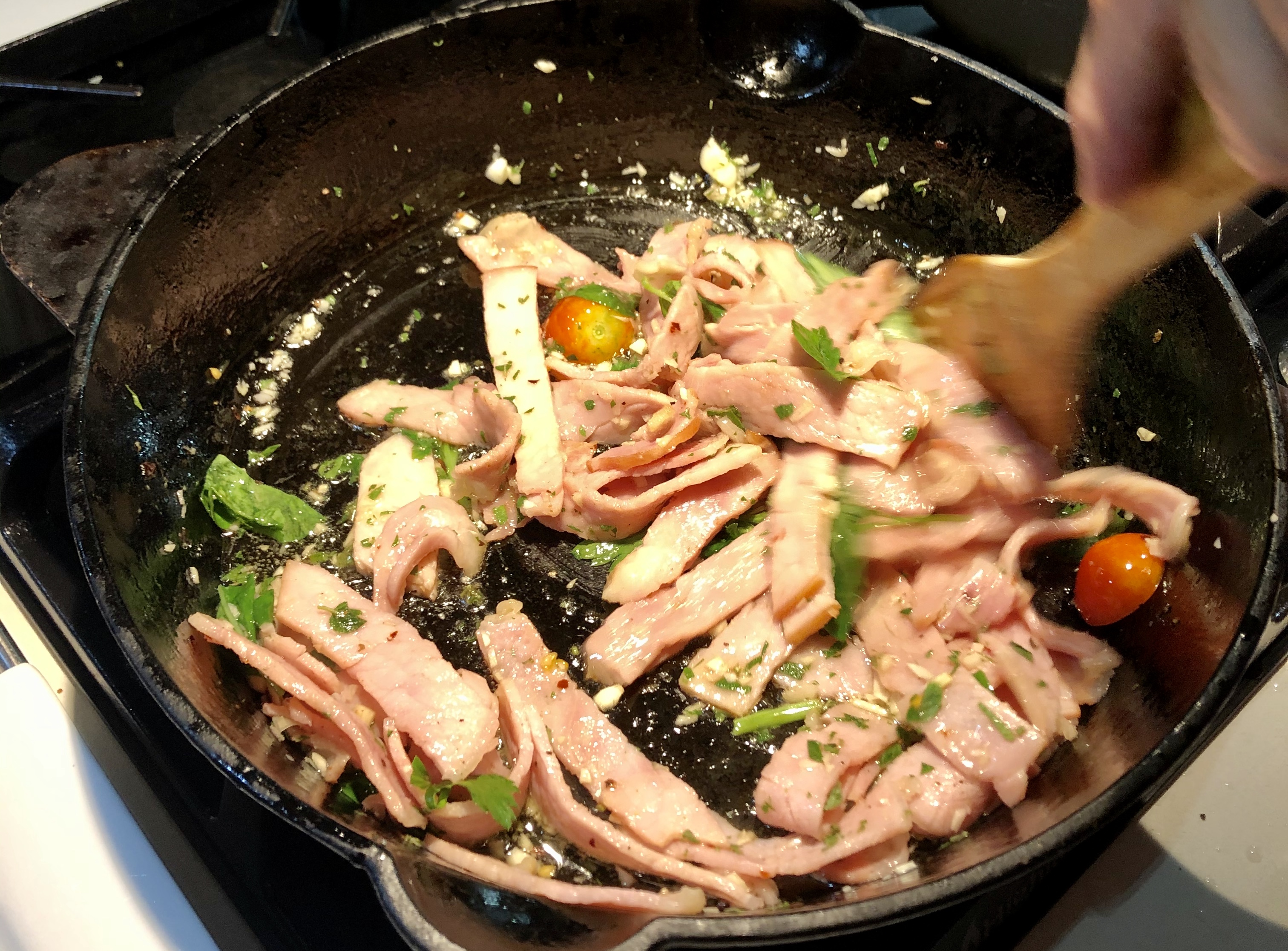 - 달궈진 팬에 (약한 불로 줄이고) 올리브유를 넉넉히 두르고, 곧바로 마늘을 넣고, 마늘향이 날 때까지 30~60초 볶아준다. 마늘향만 나면 되고, 마늘이 갈색돌게하면 안된다. 탄 마늘 (=갈색)은 나중에 쓴 맛의 원인이 된다.