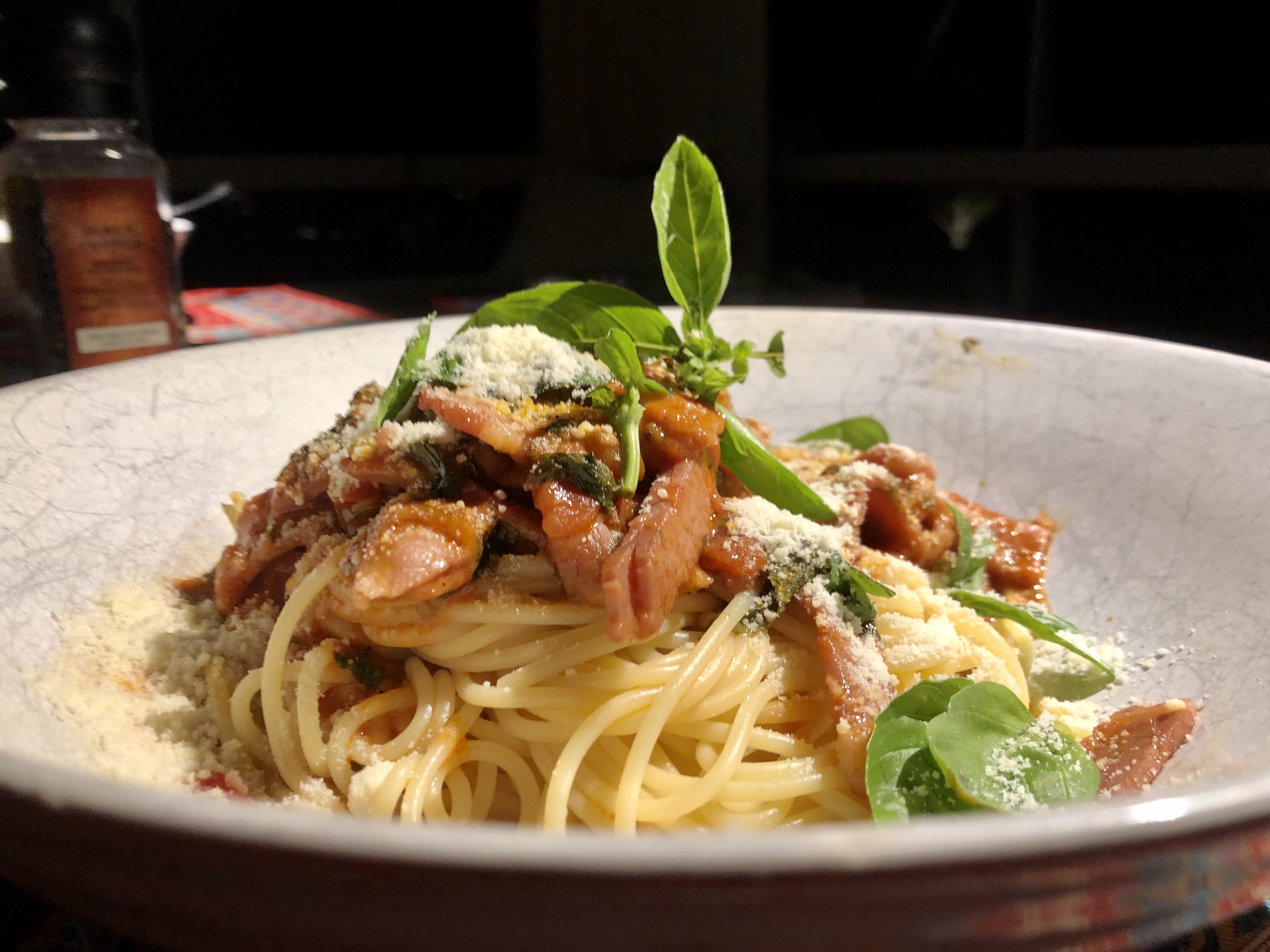 10. 준비된 따뜻한 접시에 스파게티 면을 담고, 그 위에 토마토 소스를 끼얹은 다음, 파마산 치즈를 좀 과하다 싶게 마음껏 흩뿌리고, 마지막으로 남은 바질을 손으로 찢어서 장식한다.