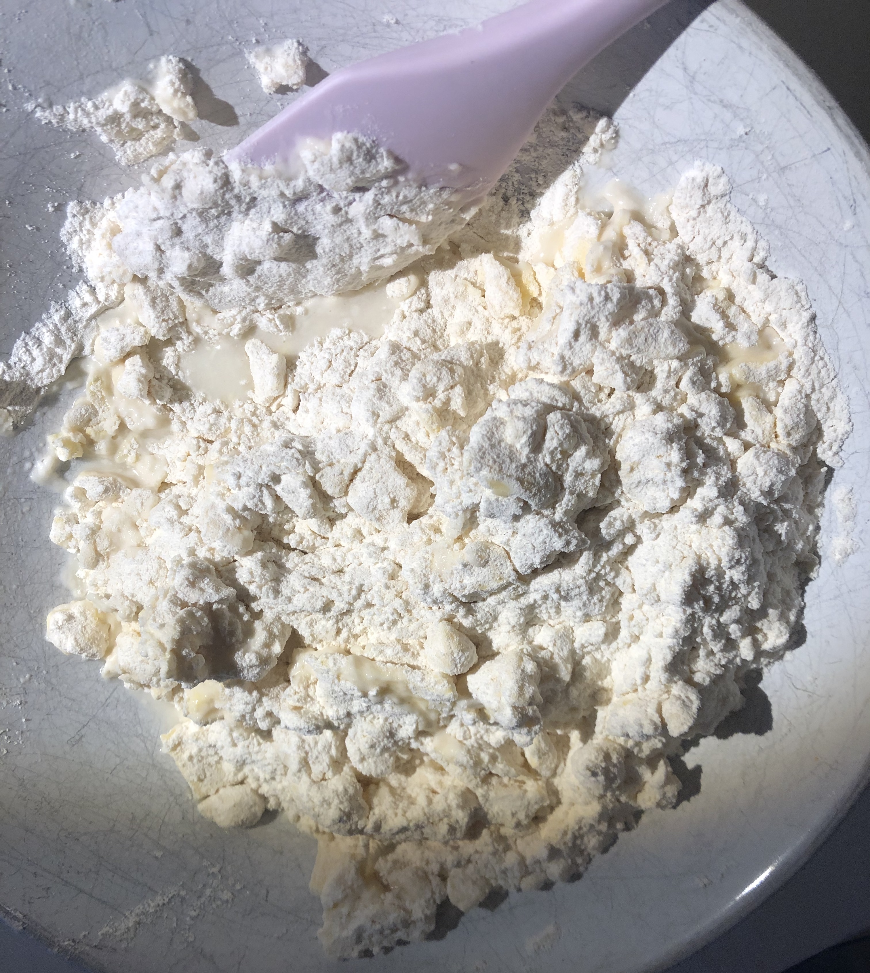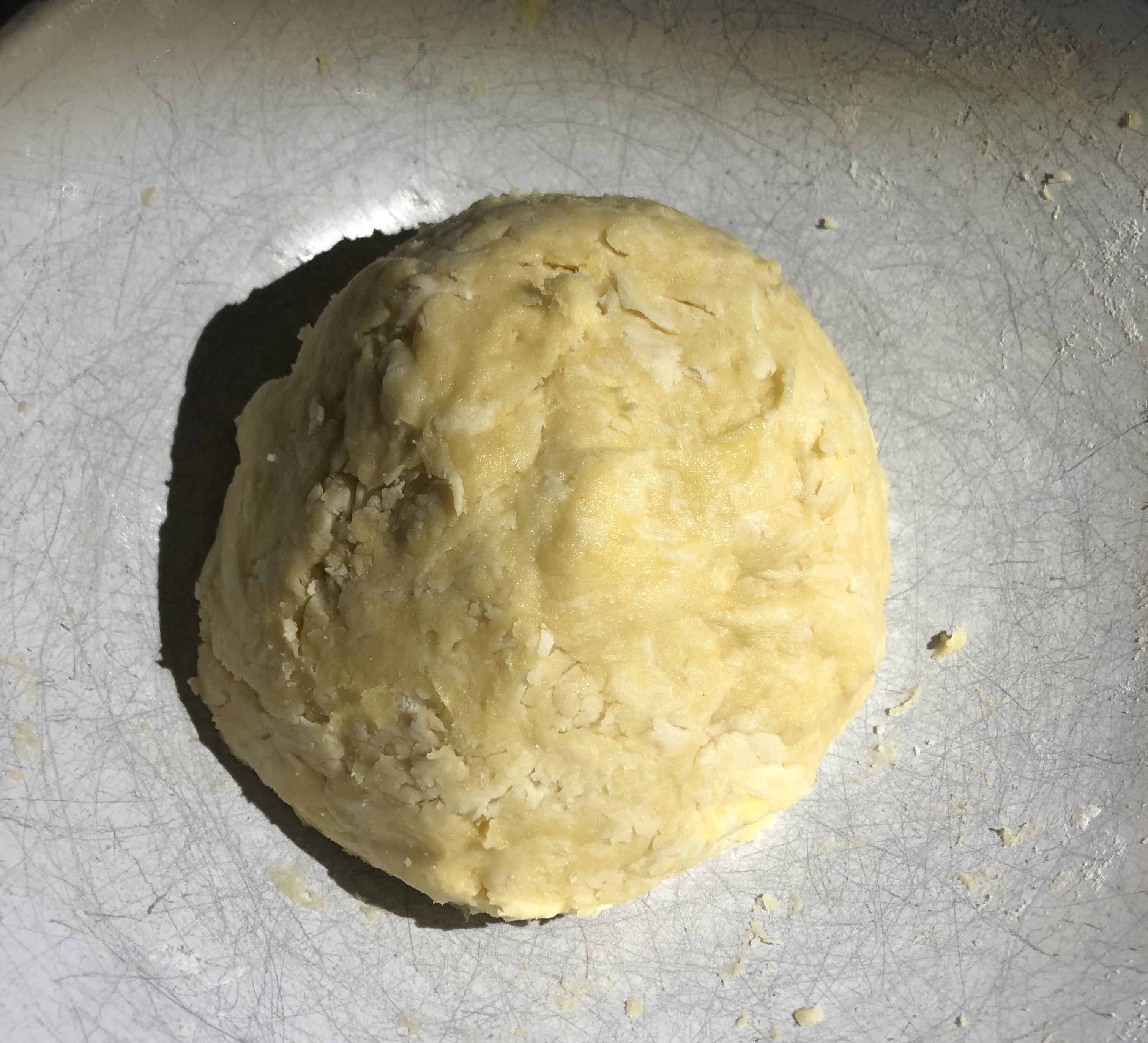 2. 버터 + 물 + 밀가루가 골고루 작게 덩어리가 지면, 손으로 꾹꾹누르며 재빠르게 반죽해준다. 완벽할 필요는 없고 한개로 뭉치기만 하면 된다. 그런 다음 랩으로 싸거나 밀폐용기에 담아서 파이속을 준비하는 동안 냉장고에 넣어둔다.