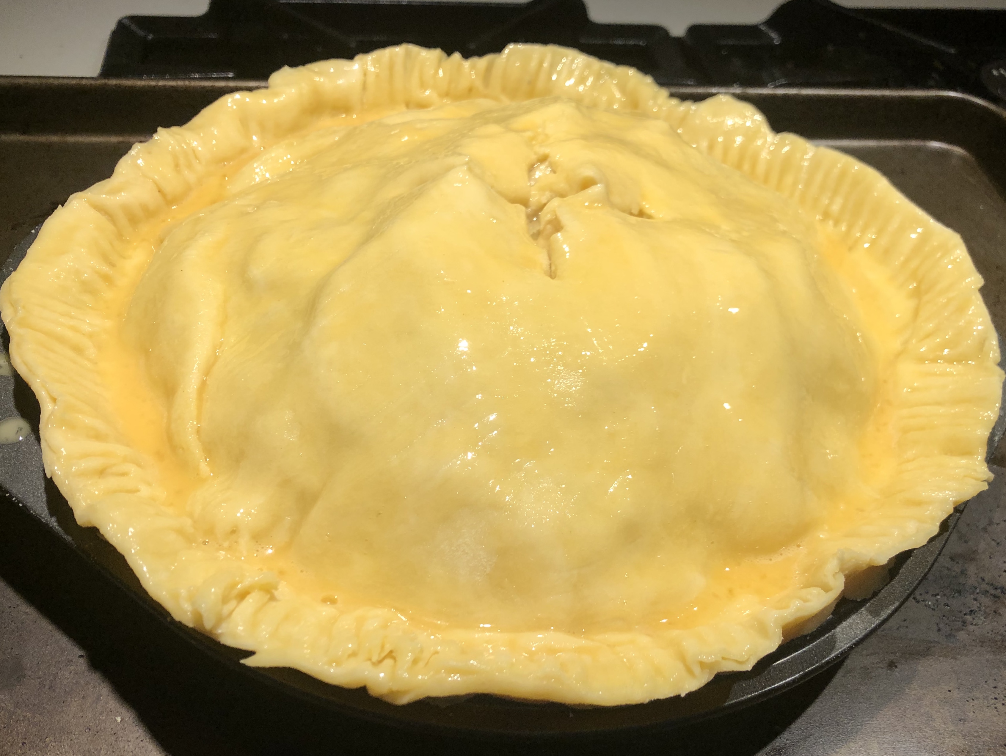 7. 냉장고에서 파이틀을 꺼내 준비된 파이 속을 모두 담아준다. 가운데가 볼록해도 괜찮다. 나중에 오븐 안에서 구워지며 다 평평해진다. 주의할 점은 파이지 가장자리를 덮지않도록 하는 것. 그런 다음 나머지 반죽을 방망이로 감아서 파이틀 위에 펼쳐 준 다음, 손으로 가장자리를 꾹꾹 눌러 접합해준다. 가장자리는 - 주방용 가위로 정리해주고, 손으로 혹은 포크로 꾹꾹 눌러 모양을 내준다.