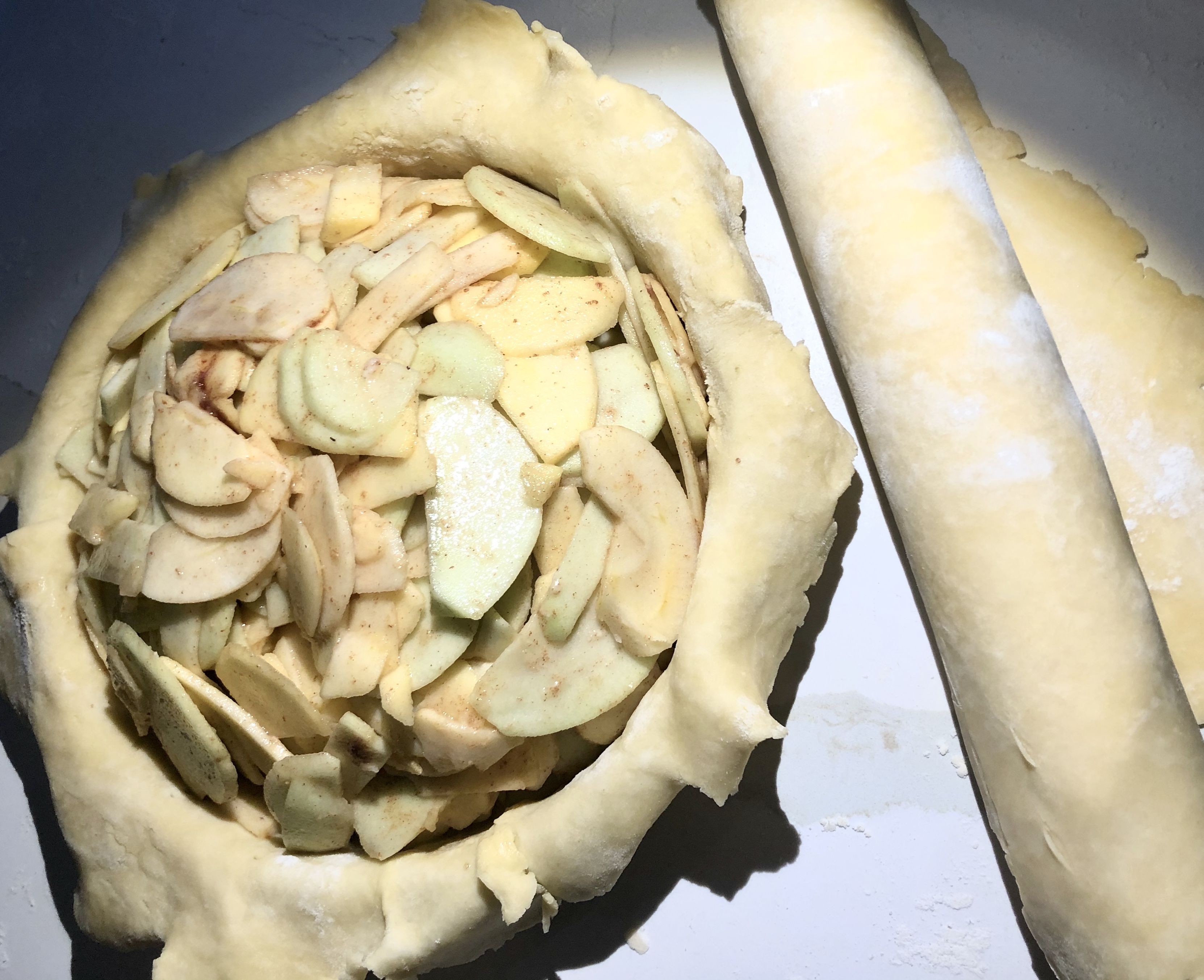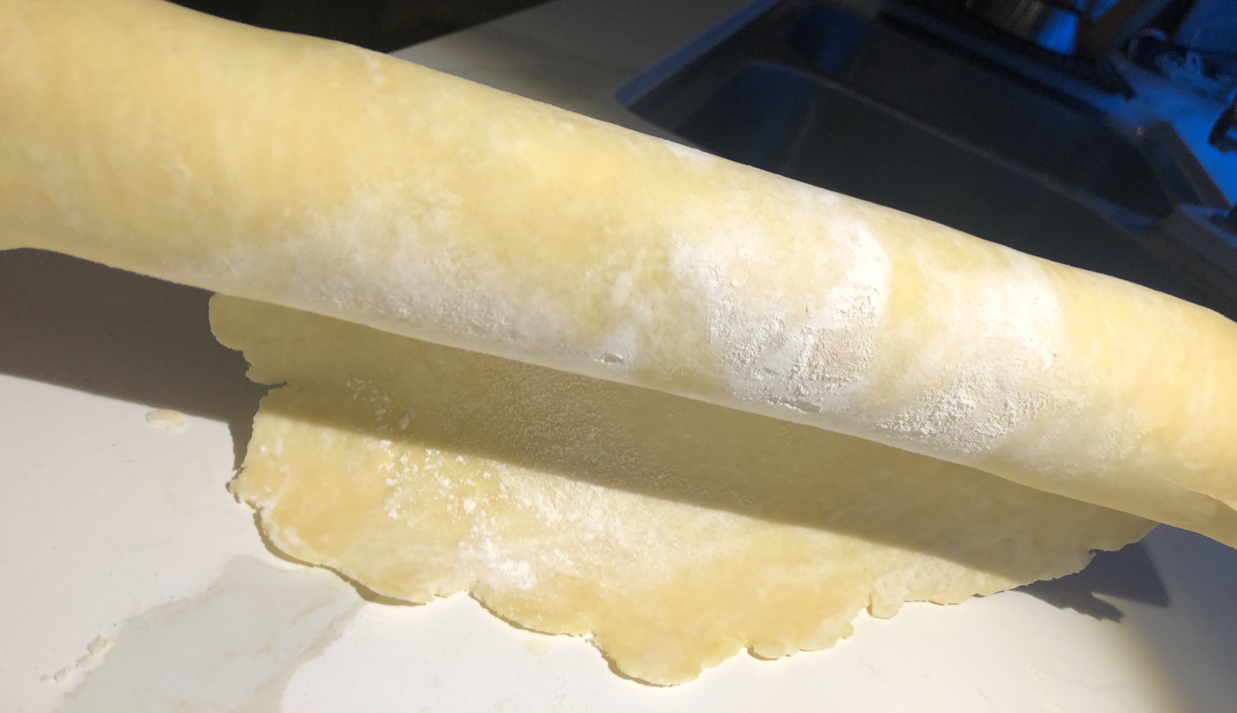 파이지를 담은 파이틀은 그대로 냉장고에 넣어두고, 작은 반죽을 꺼내서 같은 방법으로 파이틀 크기보다 조금 크게 (=파이틀 지름 + 3~4 cm 여유) 밀어준다. 이번 것은 파이 위에 올라갈꺼다.
