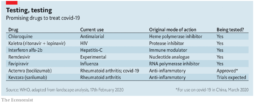 요즘 회사 메일함에 읽어야지 하고 따로 보관해두고는, 정작 아직까지 안읽어본 이메일들을 정리해가는 중이다. 3월 12일자 <The Economist>에 실린 기사에 따르면 코로나 치료제 후보로 다음의 것들이 예상되고 있었다.