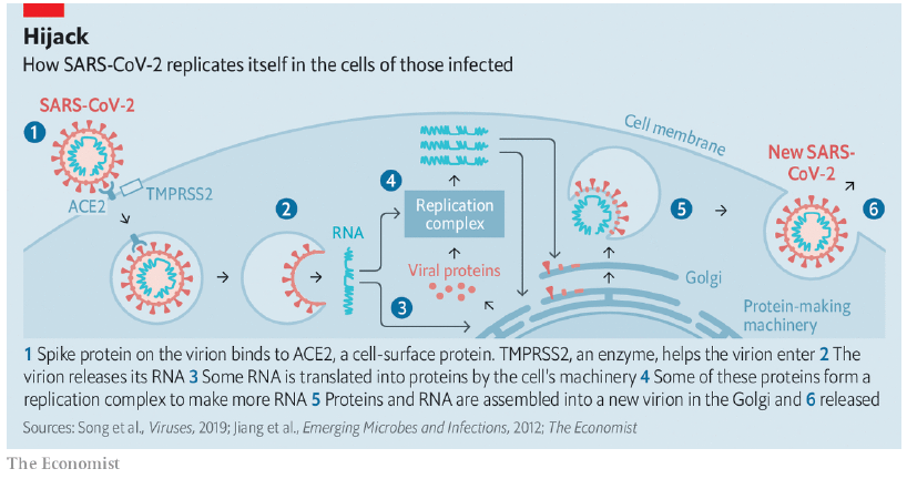 코로나 치료제라고 하는 것들은 코로나 바이러스가 인체 (혹은 숙주)에 들어가서 증식하는 과정 중 어느 단계를 억제하는 기전들이다. 아래 표를 보고 - 이코노미스트 지에서 제공하는 아래 그림이 참 괜찮은 것 같아서 출처를 밝히고, 이렇게 가져와 봤다.
