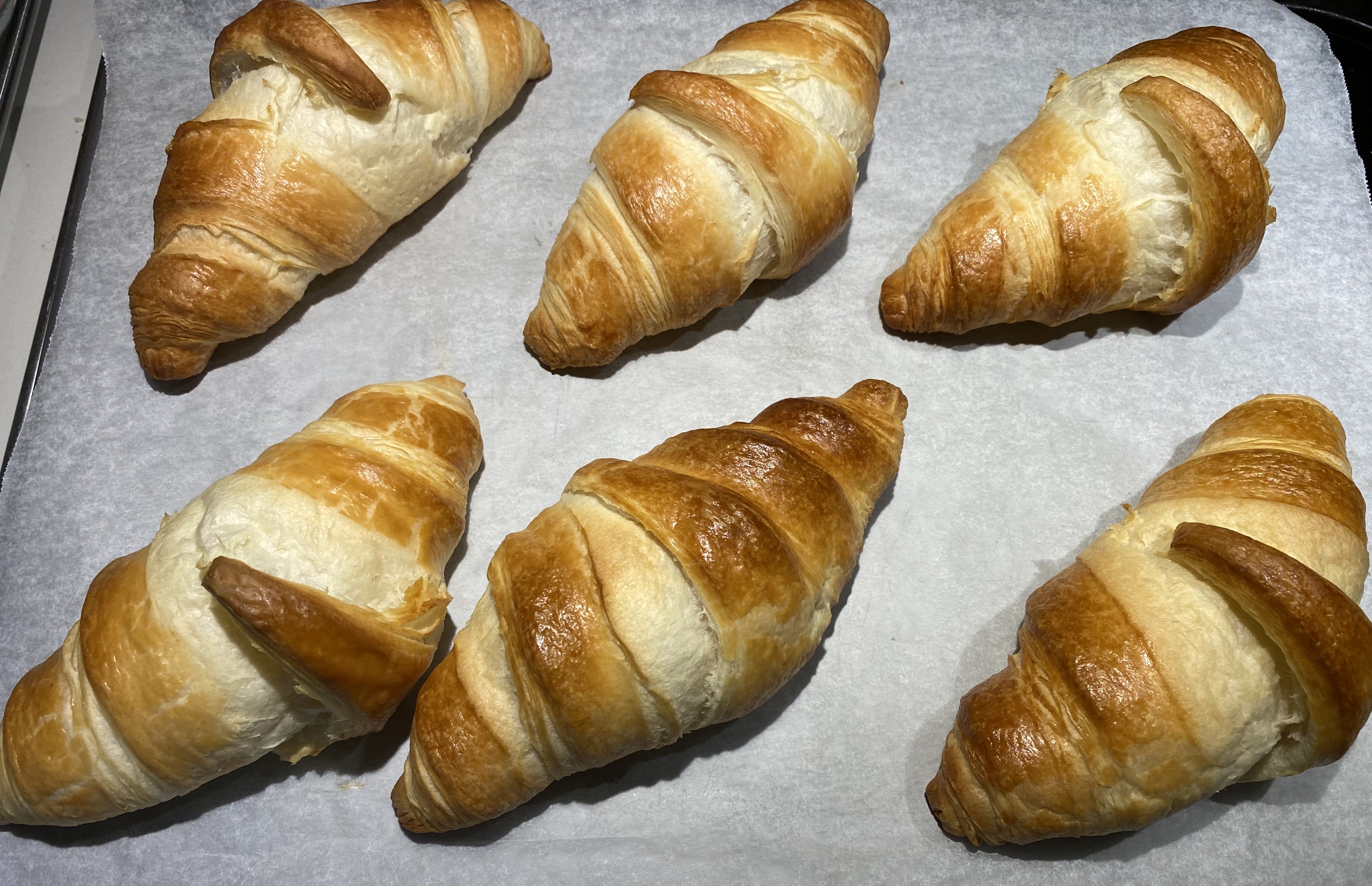아무튼....... 집에서 크로와상을 반죽부터 해서 만드는건 절대로 엄두가 안나는데 - 반죽되어 성형된걸 오븐에 굽는건 식은죽 먹기다. 표기에 적혀있는 대로 오븐을 175도로 예열한 다음, 베이킹 트레이에 - 베이킹 페이퍼를 깔고, 그 위에 냉동 크로와상을 올려서 20~23분 구우면 끝이다.