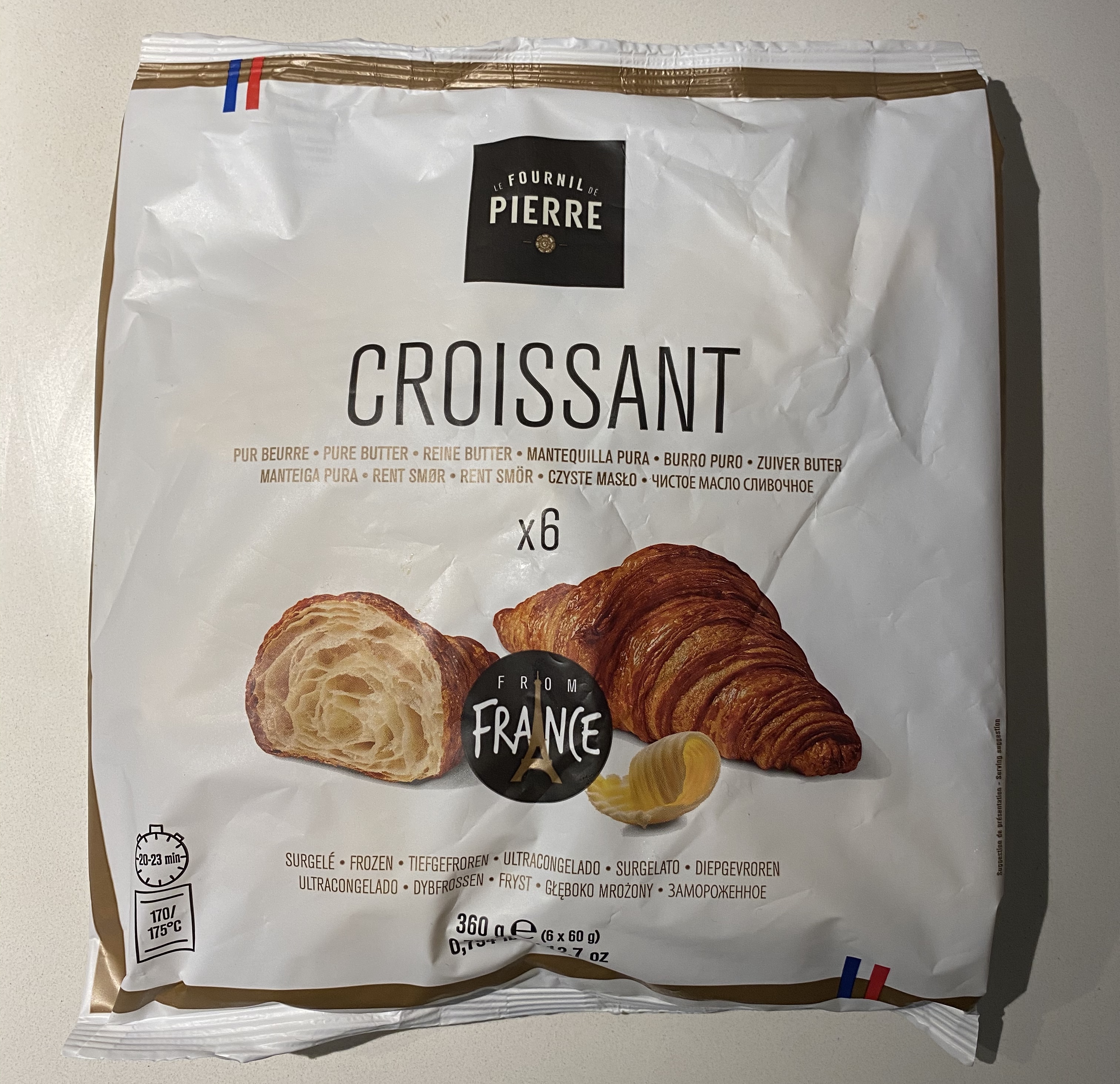 정확한 이름은 이렇다. Le Fournil De Pierre Frozen Croissant 6 pack 가격은 $7.5. 반값 할인해서 샀으니깐 한 봉지에 $3.75 주고 산거다.