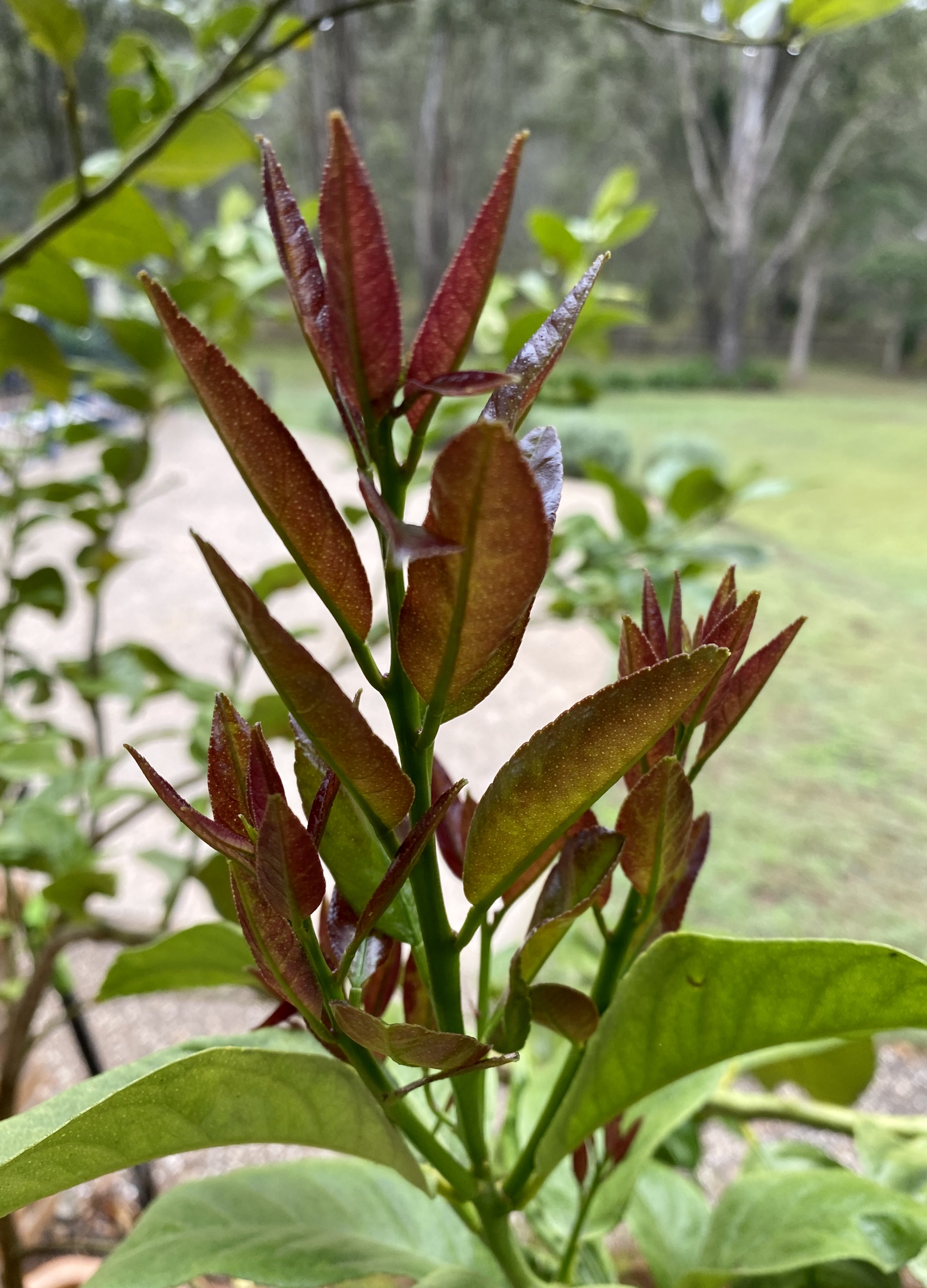 리스본 레몬 나무는 어린 잎이 솟아올를 떄는 - 아래 사진처럼 붉은갈색 (?) 빛의 새싹이 돋는데, 은근히 매력이 있는 색이에요. 독특한 새순 색깔이 정원에 다양한 색을 더해주는 것 같아서 전 좋습니다. 가을에 접어들면 보랏빛을 띈 분홍색 꽃망울이 나와서는 하얀색 꽃이 피는데 - 그 향기가 자스민 꽃이나 머라야 꽃 향기랑 비슷하게 은은하고 좋아요.