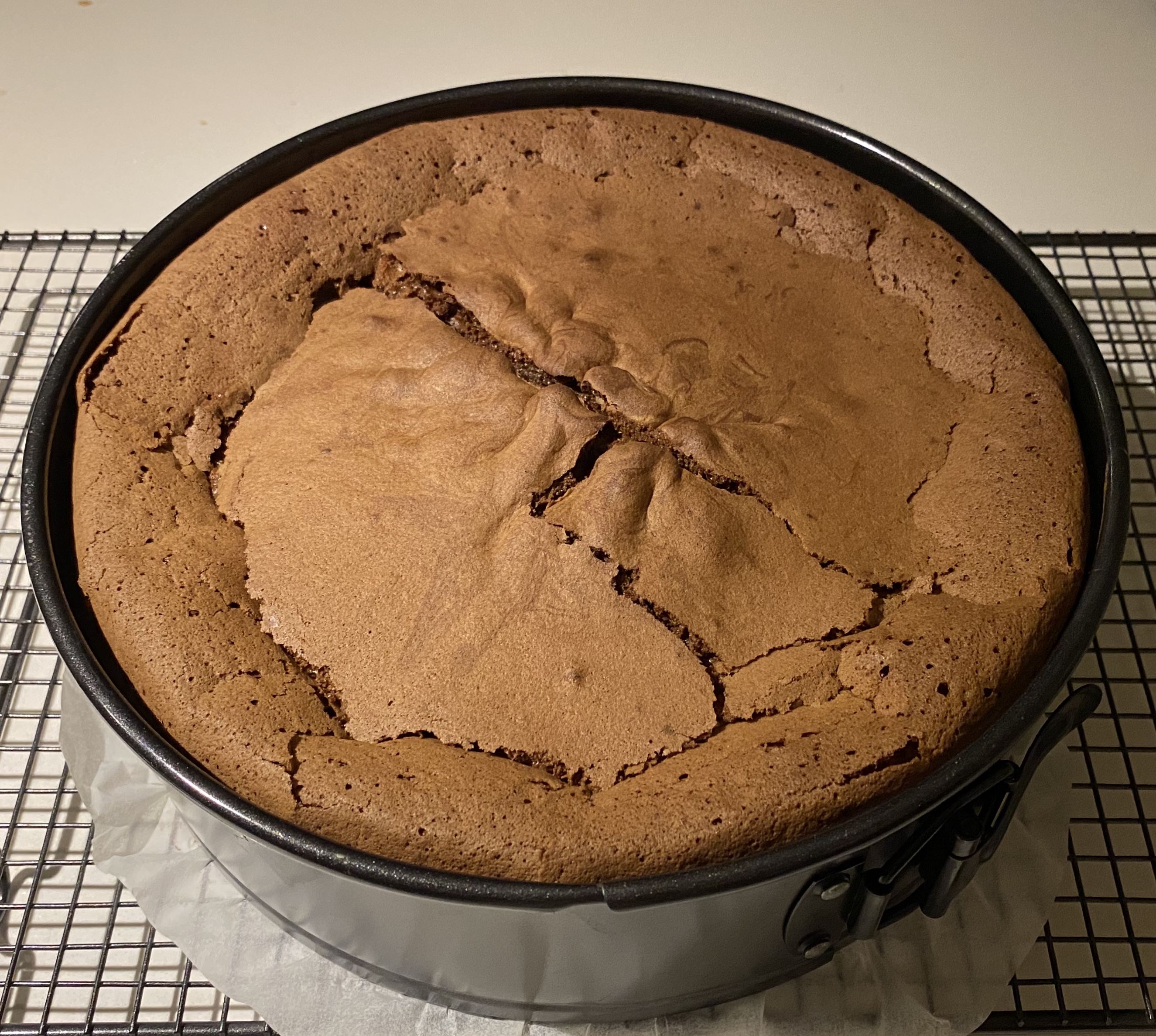 8. 케익을 오븐에서 꺼내서 식힘망에 얹어서 완전히 식힙니다. 식히다 보면 케익 가운데가 푹 꺼지게 되는데요... 이게 약간 쉬폰케익 (=계란흰자 머랭내서 넣어준 케익)처럼 구워진거라서 식으면 원래 가운데가 푹 꺼집니다. 놀라지 마세요.