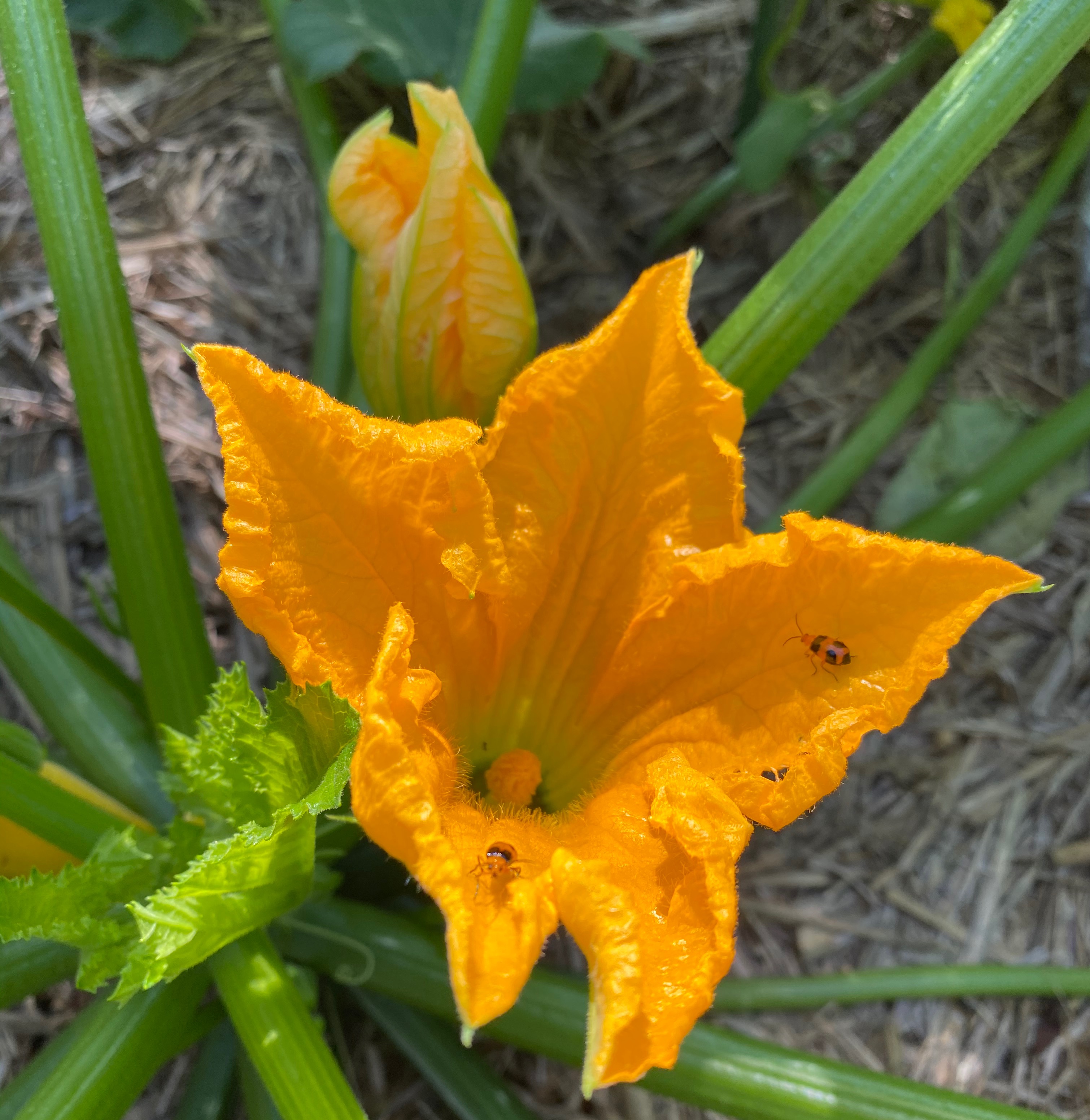 직접 수분을 시키기 위해서는 먼저 암꽃과 숫꽃 구분을 해야하죠. 아래 사진은 주키니 숫꽃 사진입니다. 숯꽃은 가운데 심이 하나만 있고요. 꽃가루가 많이 보입니다. 개미랑 곤충도 벌떼처럼 날라듭니다. 암꽃은 (사진은 없는데) 꽃 심을 보면 볼록볼록하고 평평하게 생겼고 꽃가루가 별로 없습니다. 숫꽃 보고 나서 암꽃 보면 바로 구분 됩니다.
