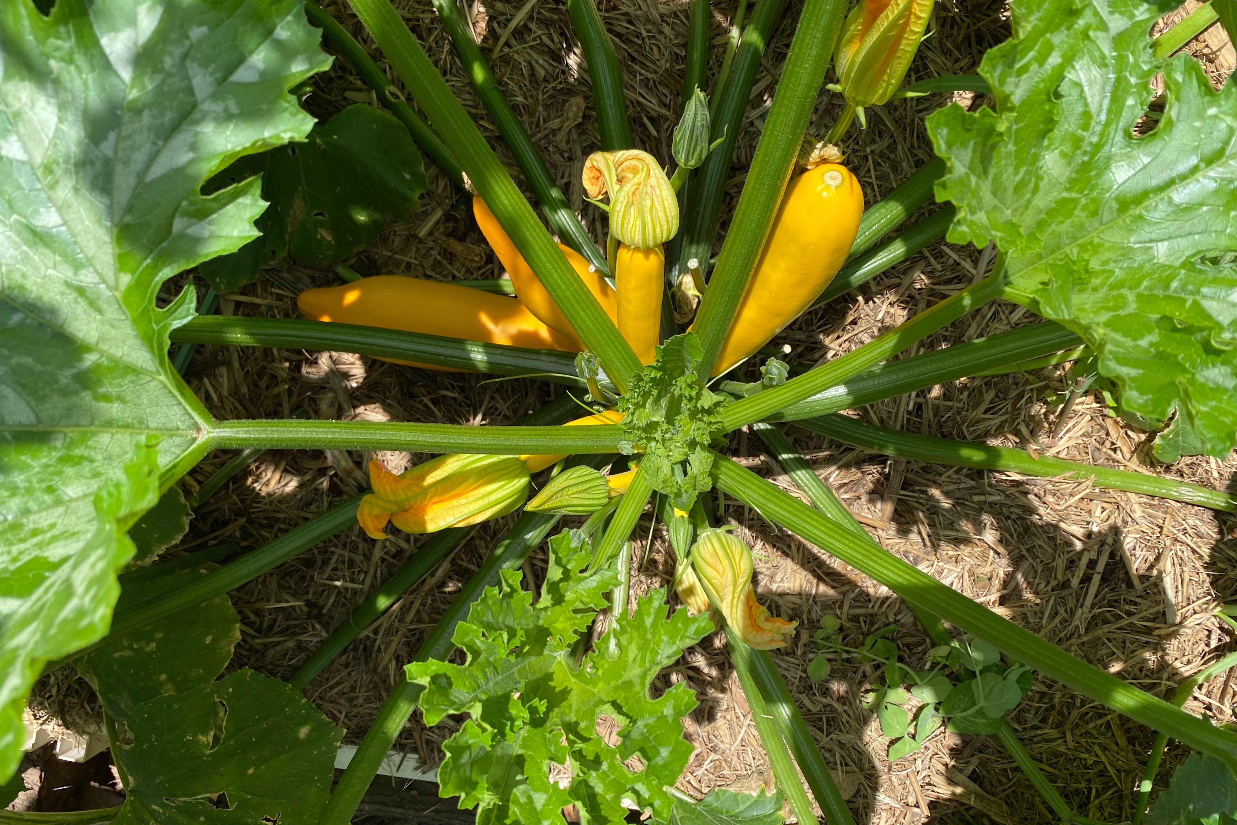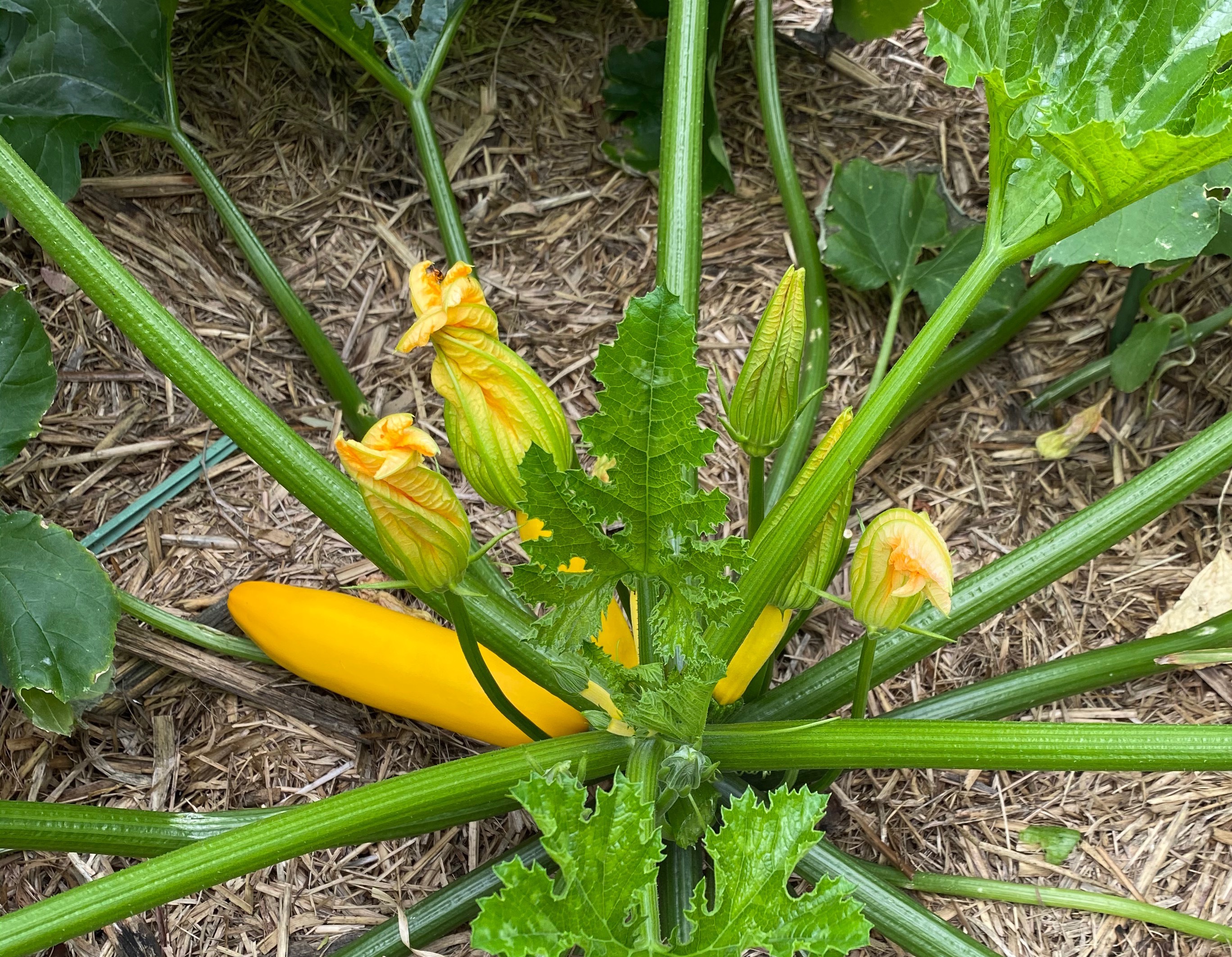 일단은 제일 왼쪽 아래에 있는 첫번째로 열린 주키니랑, 그 다음 가장 오른쪽에 하늘을 향해 쑥 솟아있는 주키니 - 요렇게 2개를 수확해 봤습니다. 주키니를 수확할 때는 손으로 꺽듯이 따면 주키니 가지에 상처를 줄 수 있으니 정원용 가위를 이용해서 매끈하게 잘라서 수확하세요.