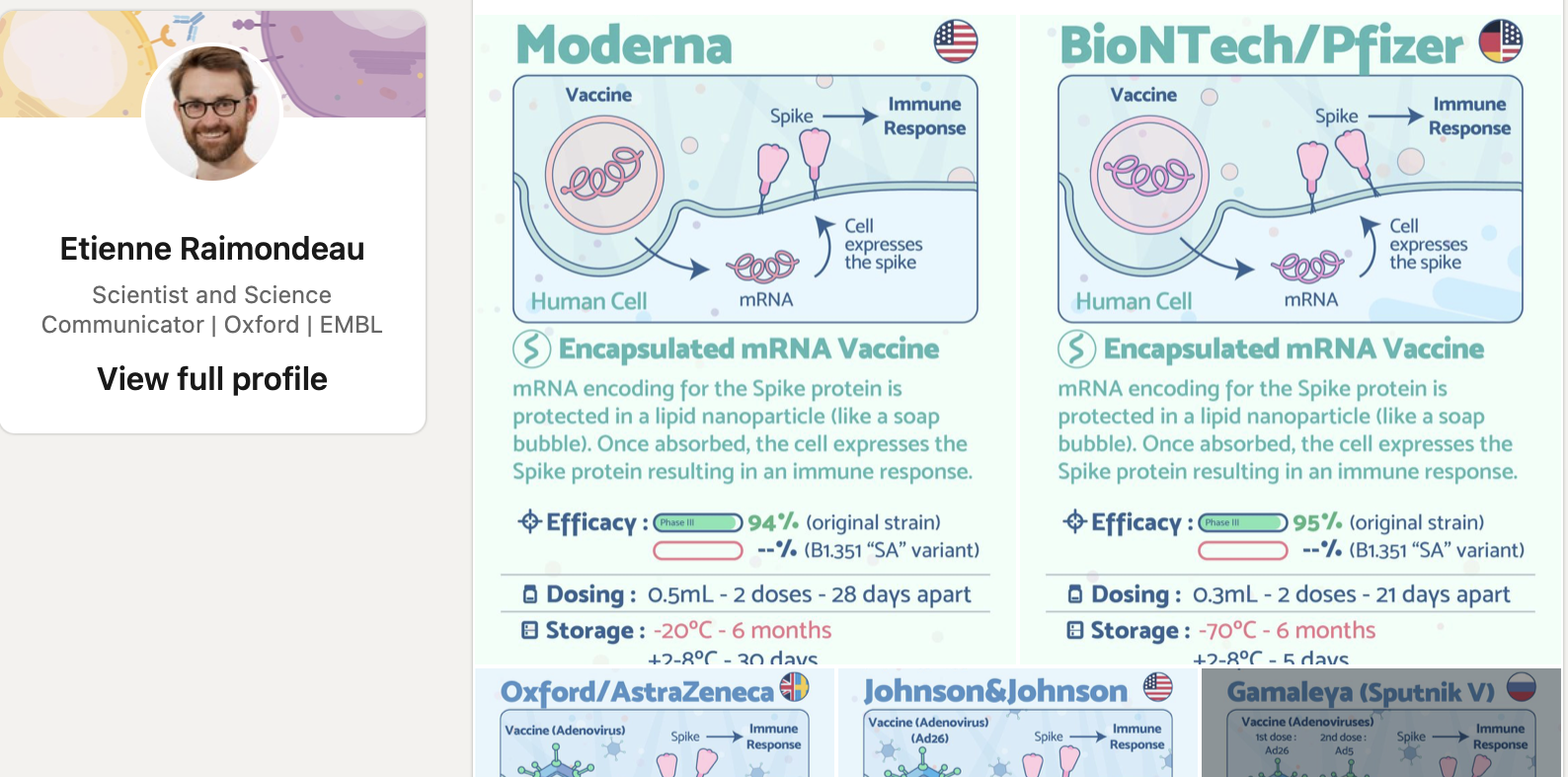 제가 직접 정보를 모아서 쓰는건 아니고요.... 어제 링크드인 (LinkedIn) 피드 올라온 것 중에서 너무 보기 좋게 잘 요약정리된게 있더라고요. 그래서 링크 걸어봅니다. 원 저자가 현재는 영어랑 프랑스어로 준비를 해뒀다고 하고, 한국어는 준비중이라는데 언제 나올지는 모르겠습니다. 그런데 - 정말 일목요연하게 보기 좋게 이해가 퐉! 되게 정리를 해놨더라고요. 각각의 백신별 특징이나 어떤 차이가 있는지 궁금하면 그냥 한 번 봐보세요.