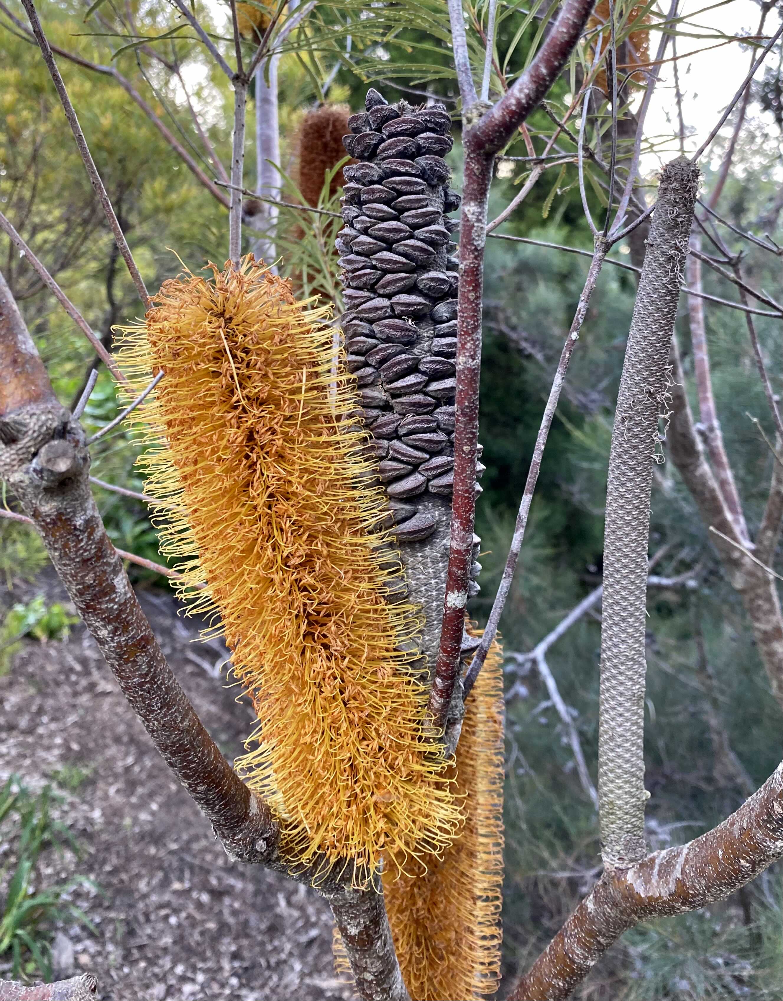 저렇게 노란 옥수수(?)처럼 생긴 아이가 꽃이랍니다. 새들이 무척 좋아해요. 그리고 아래 사진 중 하나에 보면 방카시아가 꽃이 지고 씨앗(?) 형태로 남아있는게 있는데 - 호주에 자연적으로 산불이 나면, 저런 씨앗들이 불에 타면서 톡톡 터져서 씨앗을 퍼트린다고 합니다. 결국 호주에서 산불은... 자연계 순환 및 번식에 필요한 요소인거죠.