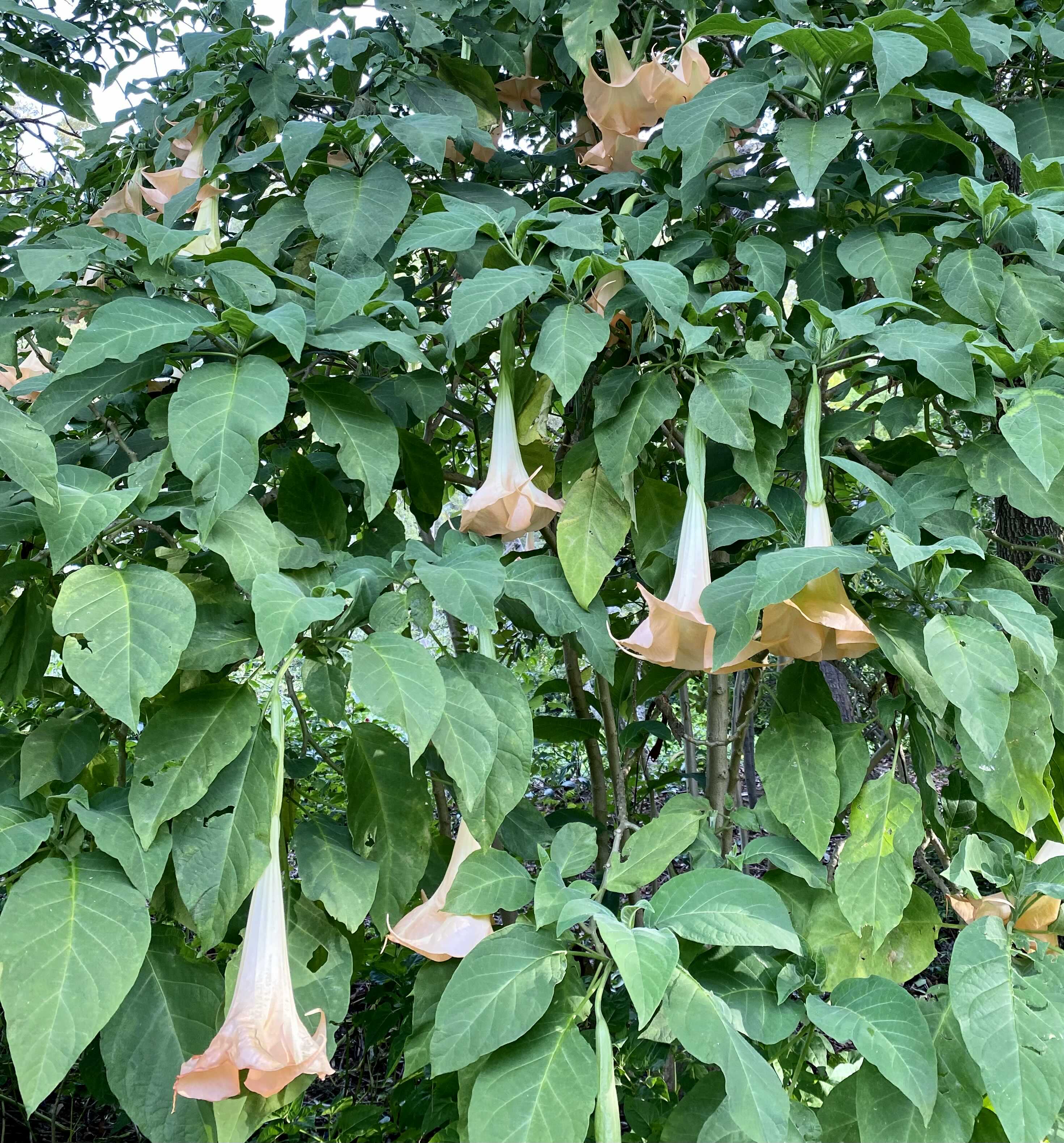 그리고 요 아이도 발견했어요. 워낙에 브리즈번에서 정원 좀 가꾼다 하는 사람들은 이것도 고려해보지 않을까 싶은데요... 트럼펫을 거꾸로 달아놓은 것 같은 그런 모양이랍니다. 꽃 자체도 손바다보다 큰게, 시선을 끄는 효과도 있고, 우하하기도 하고... 그래요. 요 아이의 이름은 Brugmansia versicolor 인데 흔히들 Angel's trumpet 이라고 많이 부르나봐요.