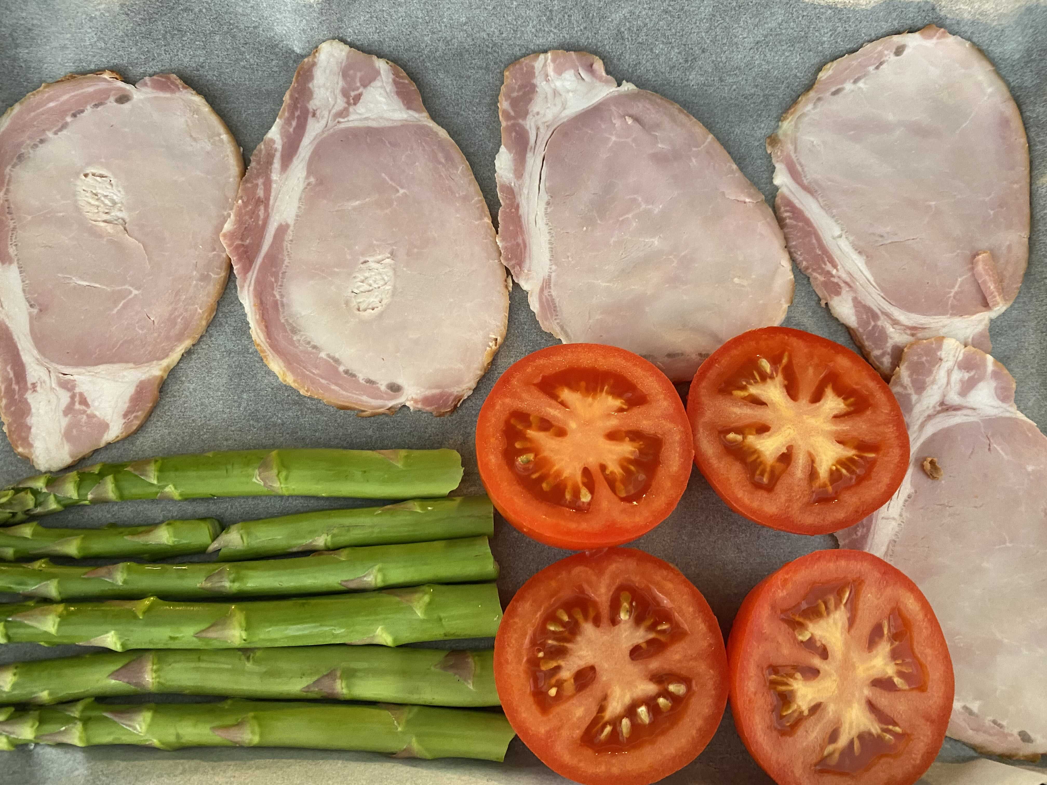 - 오븐에 구운 베이컨, 아스파라거스 토마토