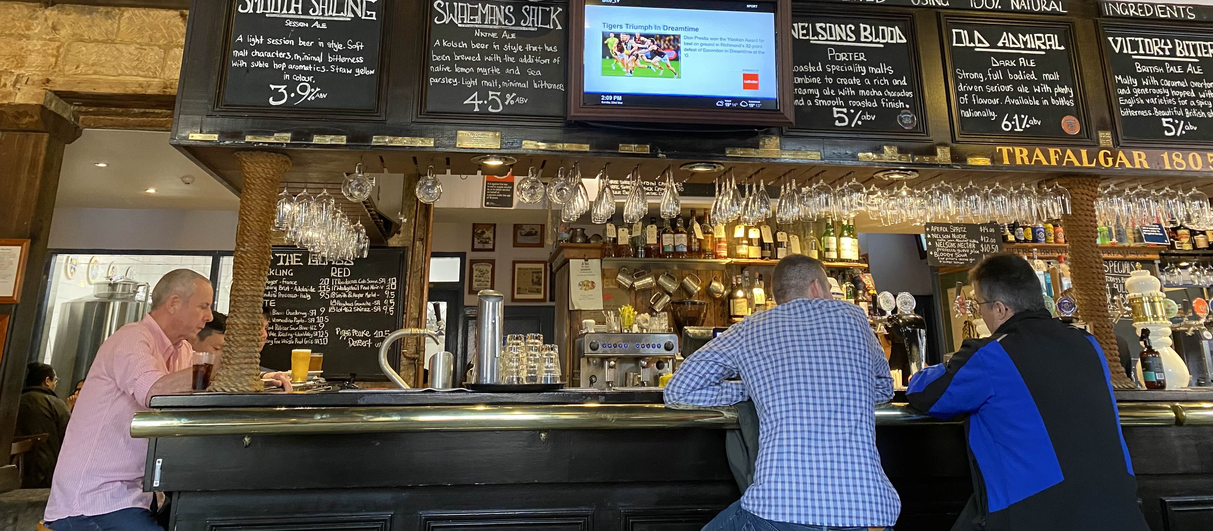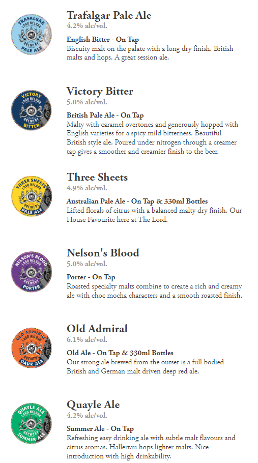 The Lord Nelson Brewery Hotel 이라는 이름이 암시하듯이 브루어리 (=맥주 양조장)가 있어서 직접 만든 맥주들을 파는데 종류도 다양하고 - CBD 임을 감안해도 가격이 착해서 - 특히 샘플링 메뉴로 주문도 가능해서 맛보는 재미가 있는 곳이다.