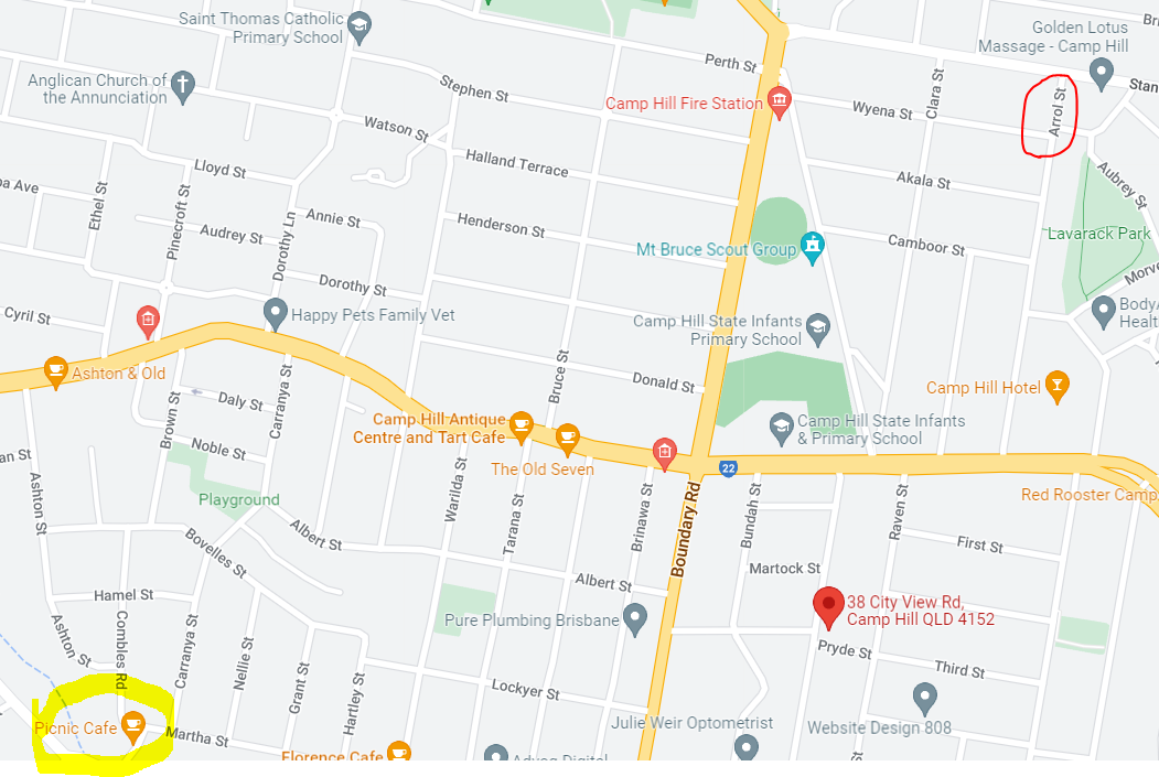 구글맵으로 보니까 캠프힐 스테이스 프라이머리가 걸어서 갈만큼 가깝고, 요즘 캠프힐의 핫한 스트릿으로 보이는 (개인적 생각) Arrol St이랑도 엄청 가깝다. 몇몇 카페랑 음식점들이 모여있는 (노란색) 곳이랑도 가깝고... 시티랑도 아마 6 km 이내이고, 지도에선 짤렸지만 울월스도 지척에 있다. 한마디로 입지가 아주 훌륭....