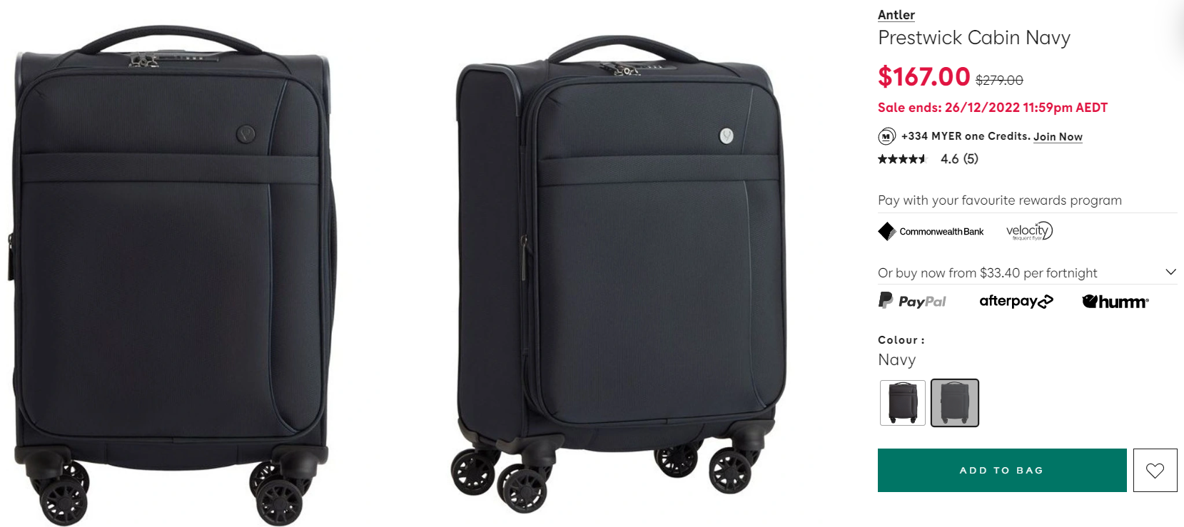 이런 이유로 박싱데이에 수트케이스를 살펴보게 되었다. 지난 10년간 관찰해본 바에 따르면 보통 Myer나 David Jones에서 수트케이스는 세일하면 40%씩 하는 경우가 많다. 어젯 밤 온라인에 뜬 가격을 보니 역시나 40% 세일이다.