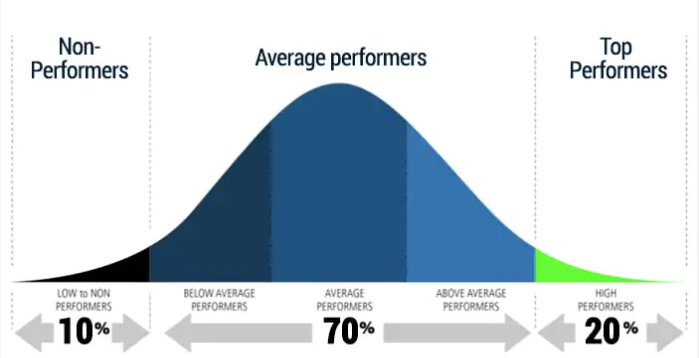 회사들마다 약간의 편차가 있기는 하겠지만 대개는 성과평가를 할 때는 5개의 카테고리로 나눠지고, 보통은 아래의 비율로 평가가 된다.