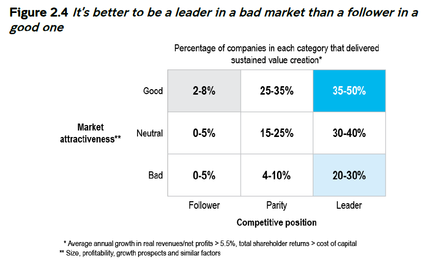 그리고 나의 눈길을 끈 것은 마켓 리더 - 즉 1위 업체의 수익률이 2위나 그 외 중소기업보다 월등히 좋다는 것이다. 즉, 투자를 할려먼 일등회사에 투자해야한다는 결론... (아래 표의 출처는 UNSW AGSM 2023 Strategy Unit 2, External Analysis, p. 25)