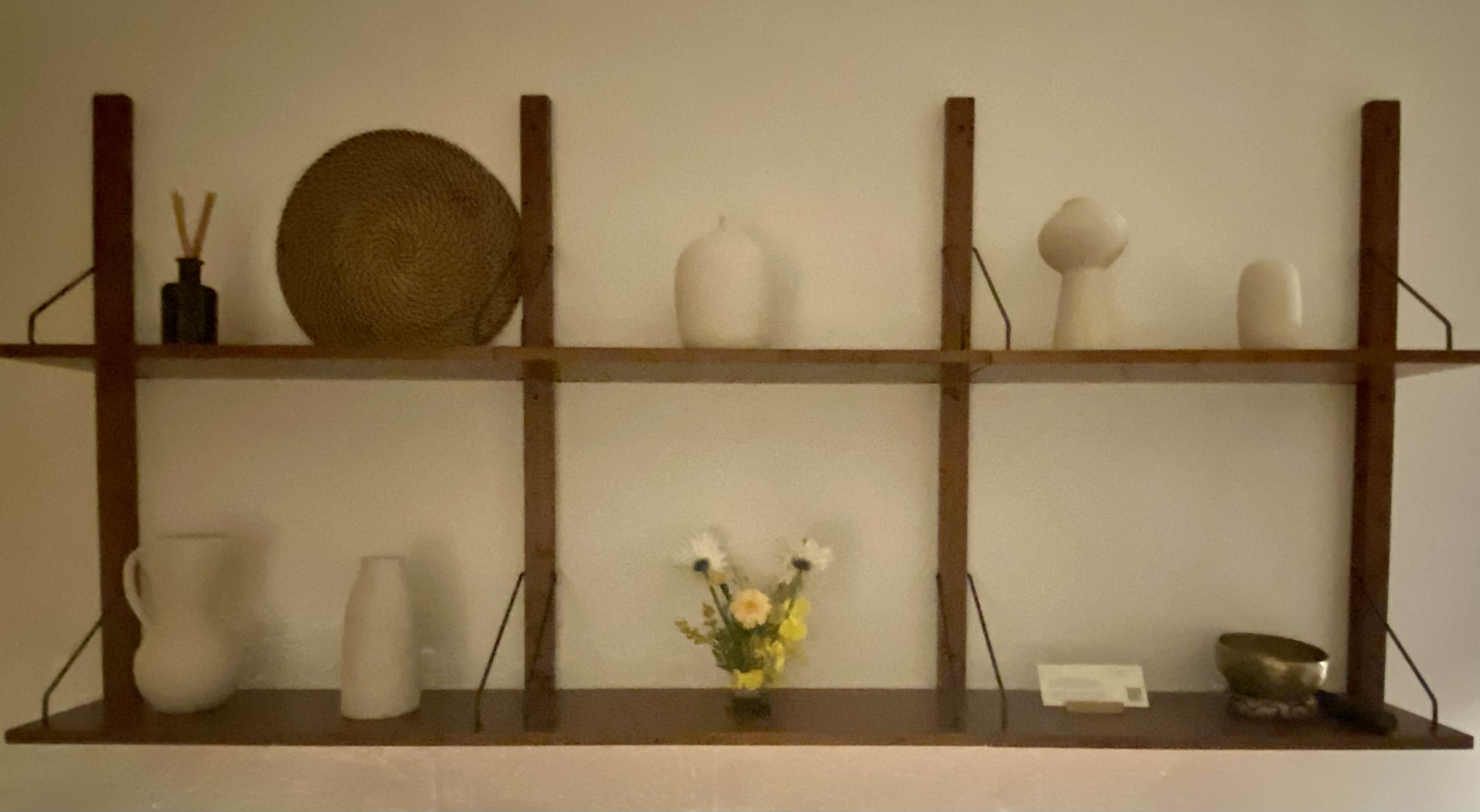 벽면 한 편에는 요런 선반을 설치해서 장식해두었는데 - 조기 명상용 싱잉볼 (요가 끝날때 울리는 징 소리 같은 소리가 남) 이 놓여있다. 싱잉볼에대한 QR 코드도 놓여있음.