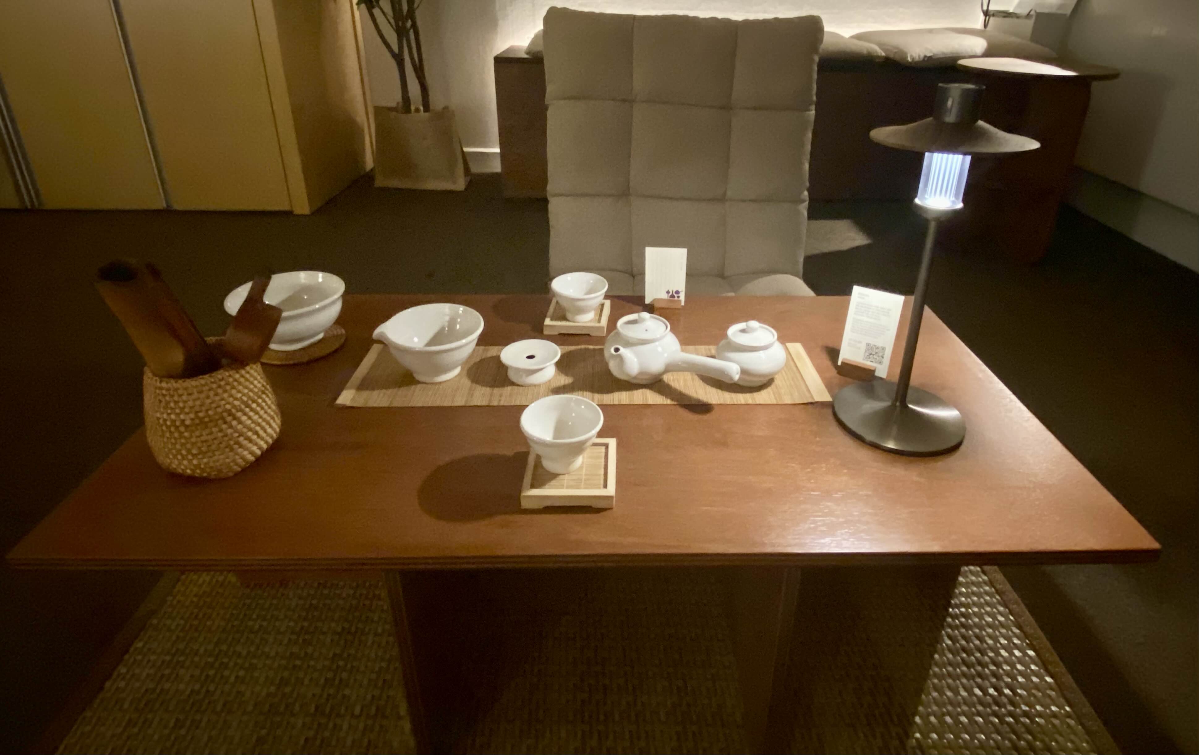 들어서면 요렇게 다기세트가 놓여져 있는 좌식 테이블이 한눈에 들어온다. 다기 사용법이나 차 우리는 법이 익숙하지 않은 사람들을 위해서 한글 및 영어로 된 설명과 함께 QR 코드를 비치해 둔 것이 눈에 띈다.