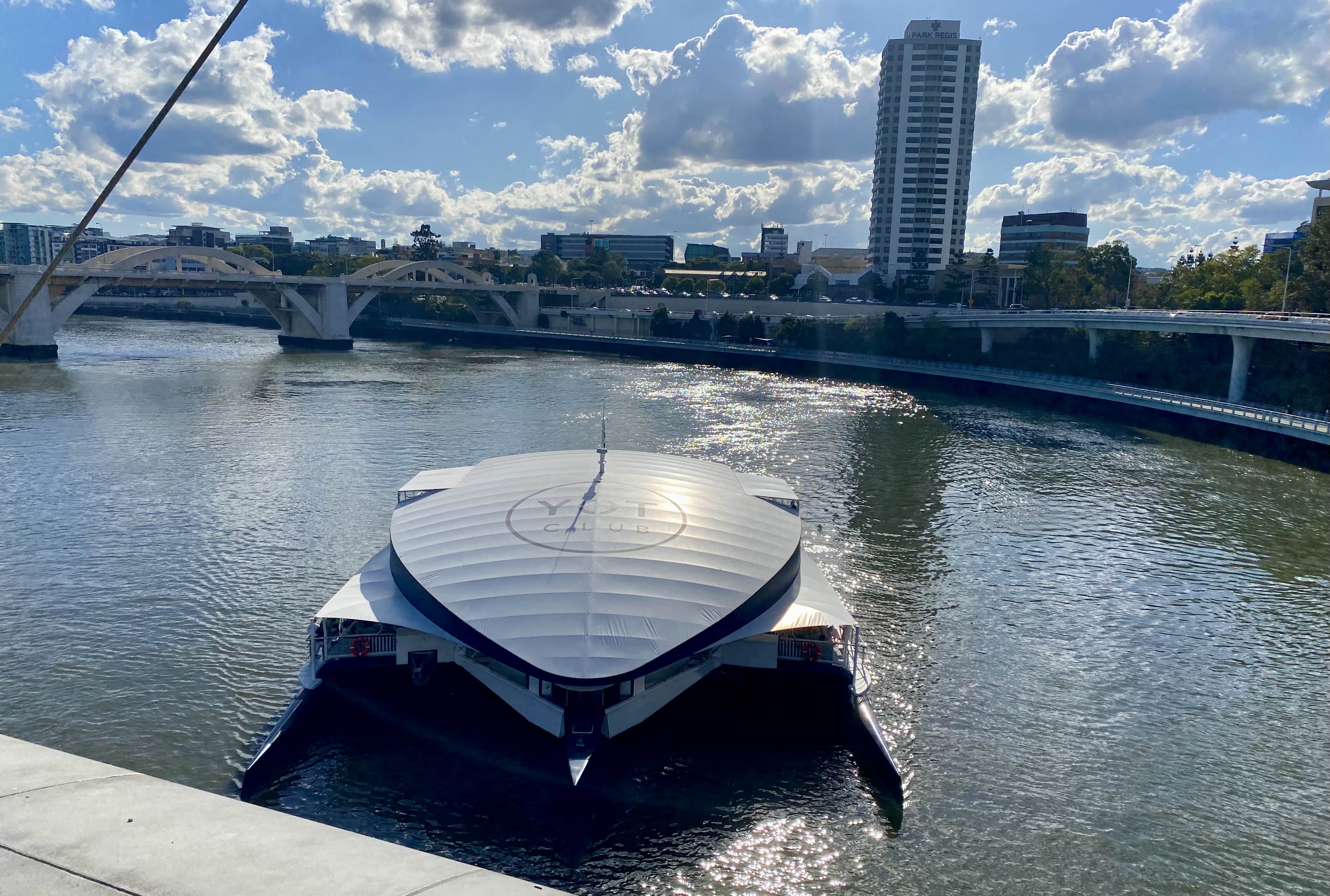 해서 착한 제가 양보해서 브리즈번 강을 따라 도심을 가로질러 산책을 하러 갔습니다. 밀튼 역 근처에 주차하고 브리즈번 강을 따라 걷다가 스토리 브릿지를 건너는데 이렇게 큰 파티용 카타마란 catamaran 이 지나가네요.