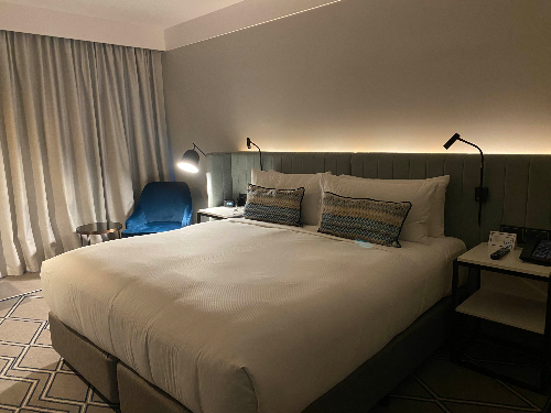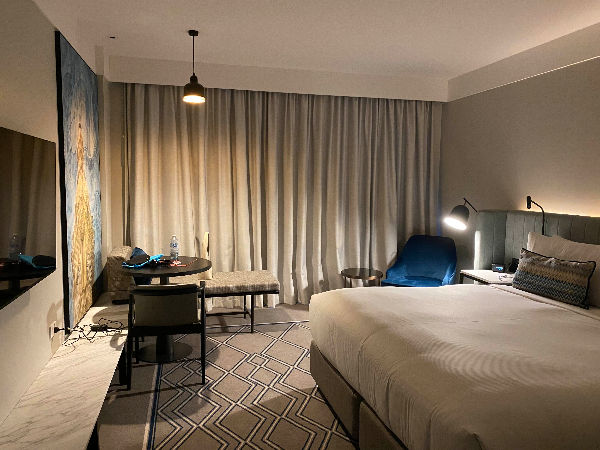 9층이었던 내 방은 전망은 - 없다. 업무차 온 나한테는 테이블이랑 딱딱한 의자 하나가 전형적인 호텔에 놓은 네모난 책상과 의자보다 업무를 보는데는 좀 더 유용했고 (내 체구에 맞았달까...?) 침대 옆에 놓인 의자랑 통유리 창문 앞에 놓인 의자도 옷을 갈아입거나, 잠깐 휴식을 취하거나 할 때 이래저래 유용했다.