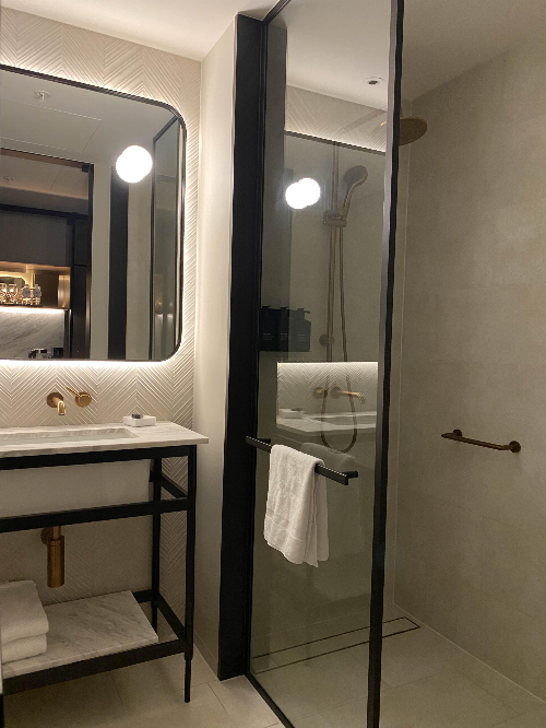 겨울이고 도착한 날이 매우 추운 날이었기에 - 욕조에 물 받아서 입욕을 좀 해야겠다 했는데 - 이 아담한 욕실에는 욕조가 없었다. 대신 블랙으로 모던하게 단장한 샤워부스 + 거울 뒷면과 거울 자체에 조명이 붙어서 메이크업 하기에 좋을듯. 알메니티는 - 샤워부스 안에 저렇게 놓여있는 것과 작은 사이즈의 핸드워시용 비누가 있는데 - 전반적으로 만족하며 사용함.