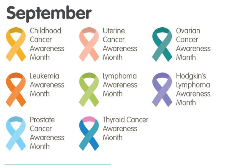 9월은 혈액암, 소아암, 부인과 암, 난소암, 전립선암, 갑상선암의 달로, 해당 암에 관련된 다양한 행사들이 열린다. (다른 달에는 다른 암들이 다양하게 배정되어있음 - 자세한 정보는 여기)