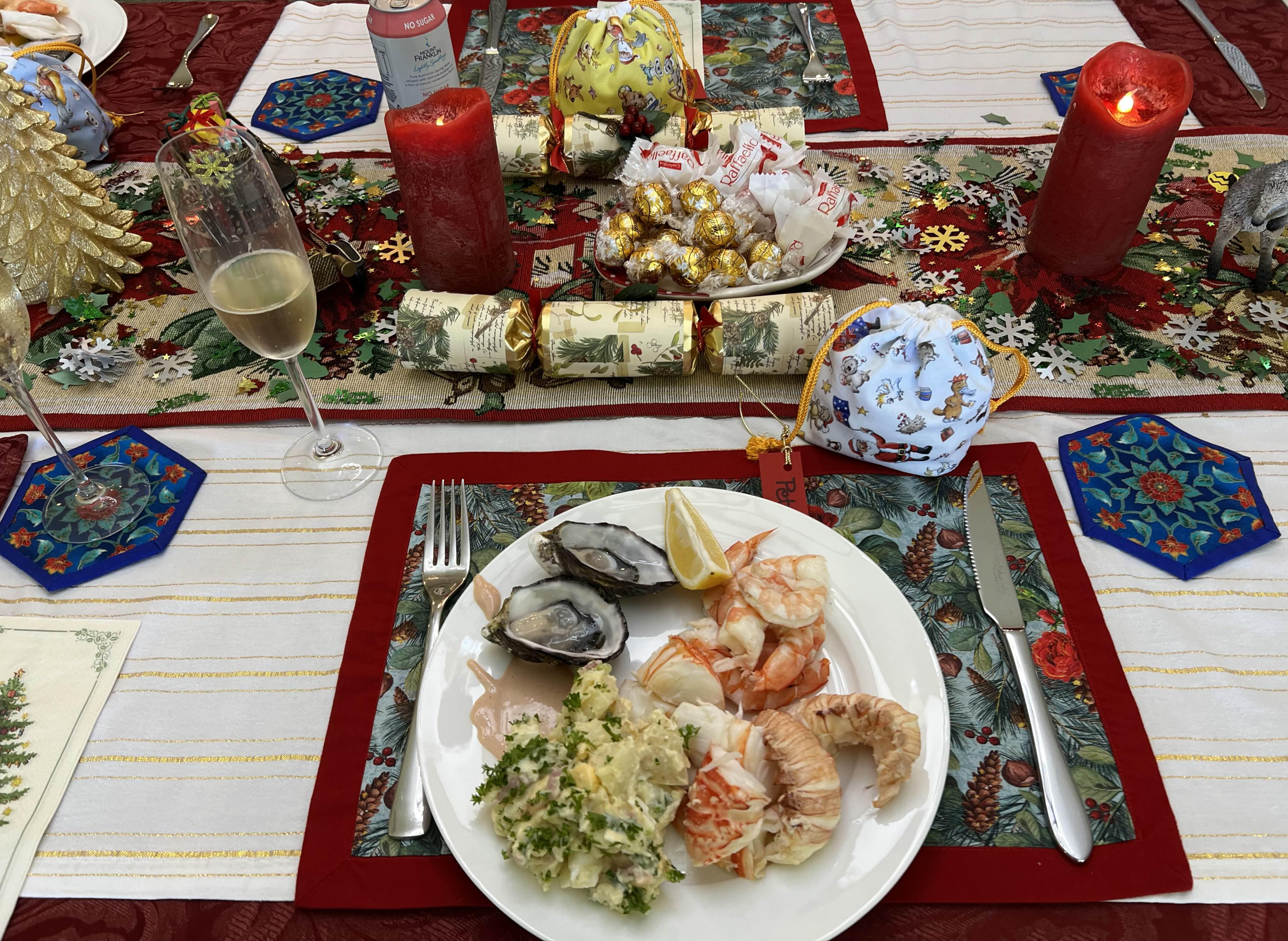 이 많은 음식은 저스틴이 혼자 한듯.... 브리즈번에 살다가 이제 탬보린 마운틴에 살기때문에, 해산물 사러는 골드코스트의 네랑 Nerang지역에 있는 씨푸드 마켓(?)으로 다녀왔다는데, 오히려 굴은 이 새로운 공급처(?)가 더 나은듯. 이 날 서빙된 해산물 - 새우를 비롯한 랍스터며 야비의 껍질을 직접 다 깠다고..... (전에는 껍질까는 헬퍼를 크리스마스 이브날 혹은 크리스마스날에 하루 고용하기도 했었는데, 지금은 마운틴 탬보린에 살고 있는지라 그렇게 사람을 고용하기가 생각만큼 쉽지 않았는지도...)