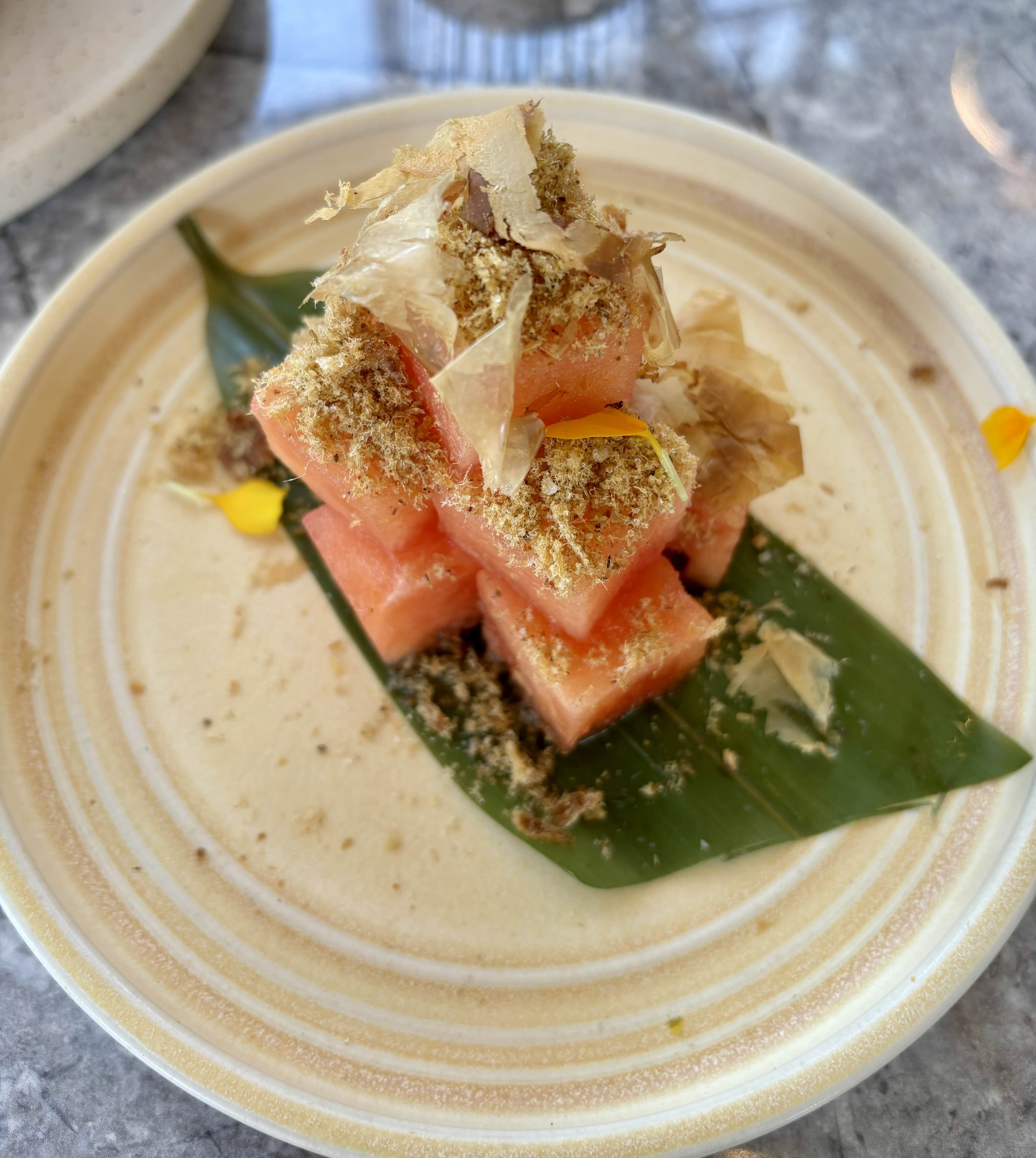 배우자는 가다랑이포 가루 식감이 흙이 입에 들어온거 같다며 싫다고 했으나 - 태국에도 여러번 갔다온 나로서는, 감칠맛을 더하는 가다랑이포와 수박의 조합이 잘 어울린다고 느꼈음. 맛있었음. 가격이 조금 사악하기는 하지만 - 프리젠테이션이 훌륭해서.... 이 가격이 이해됨.