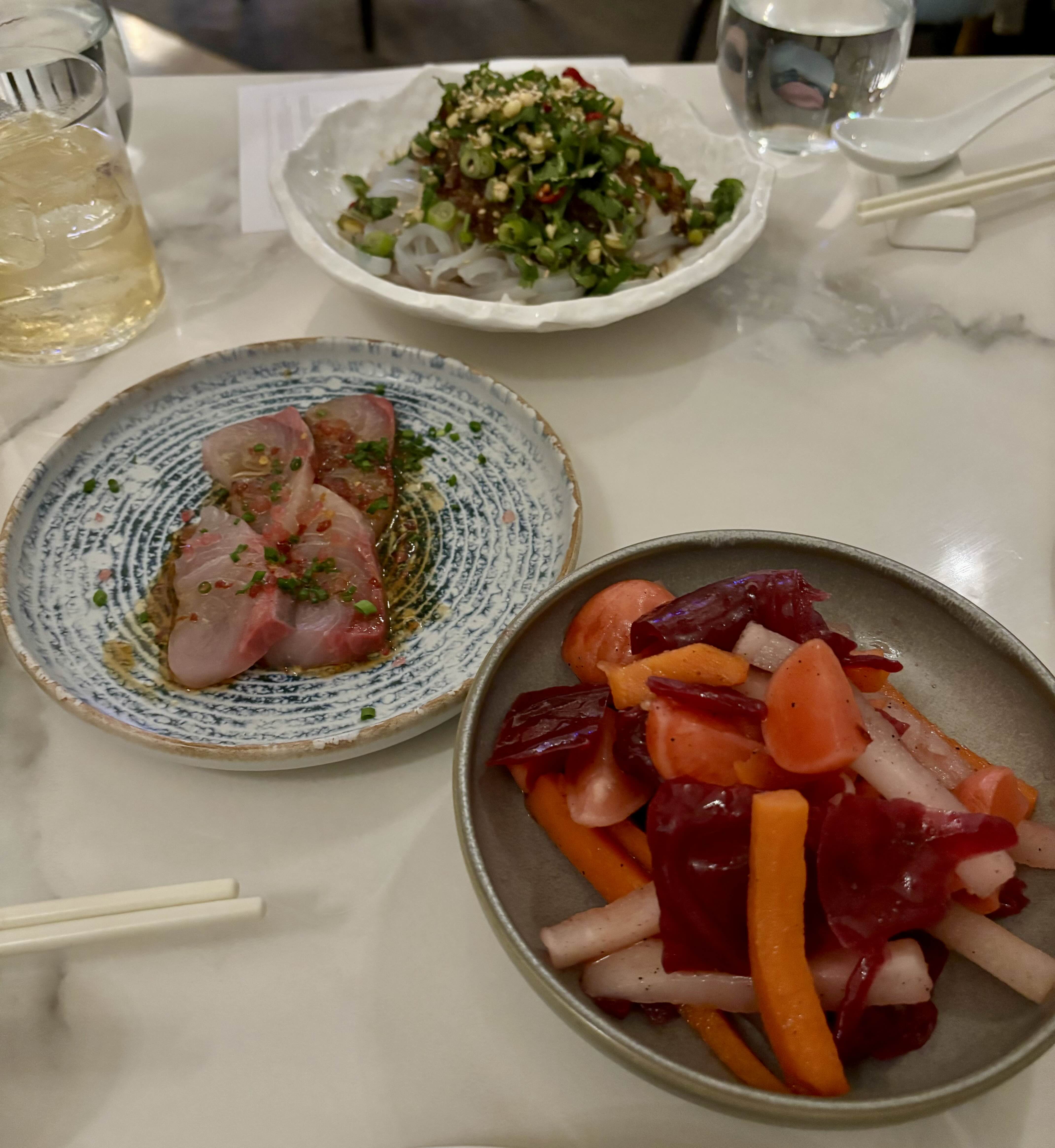 제일 먼저 나오는건 킹피쉬, 채소절임, 녹두로 만든 누들 샐러드