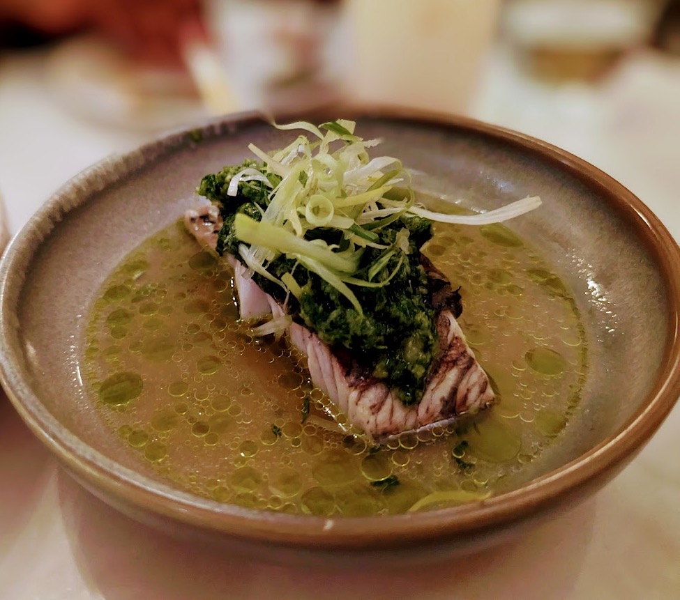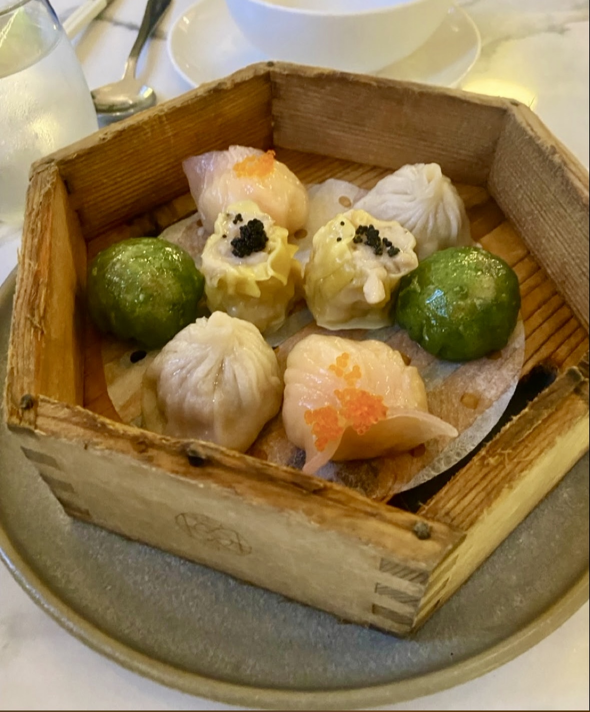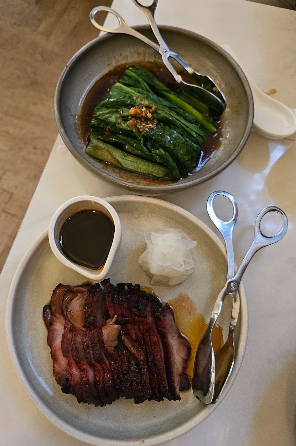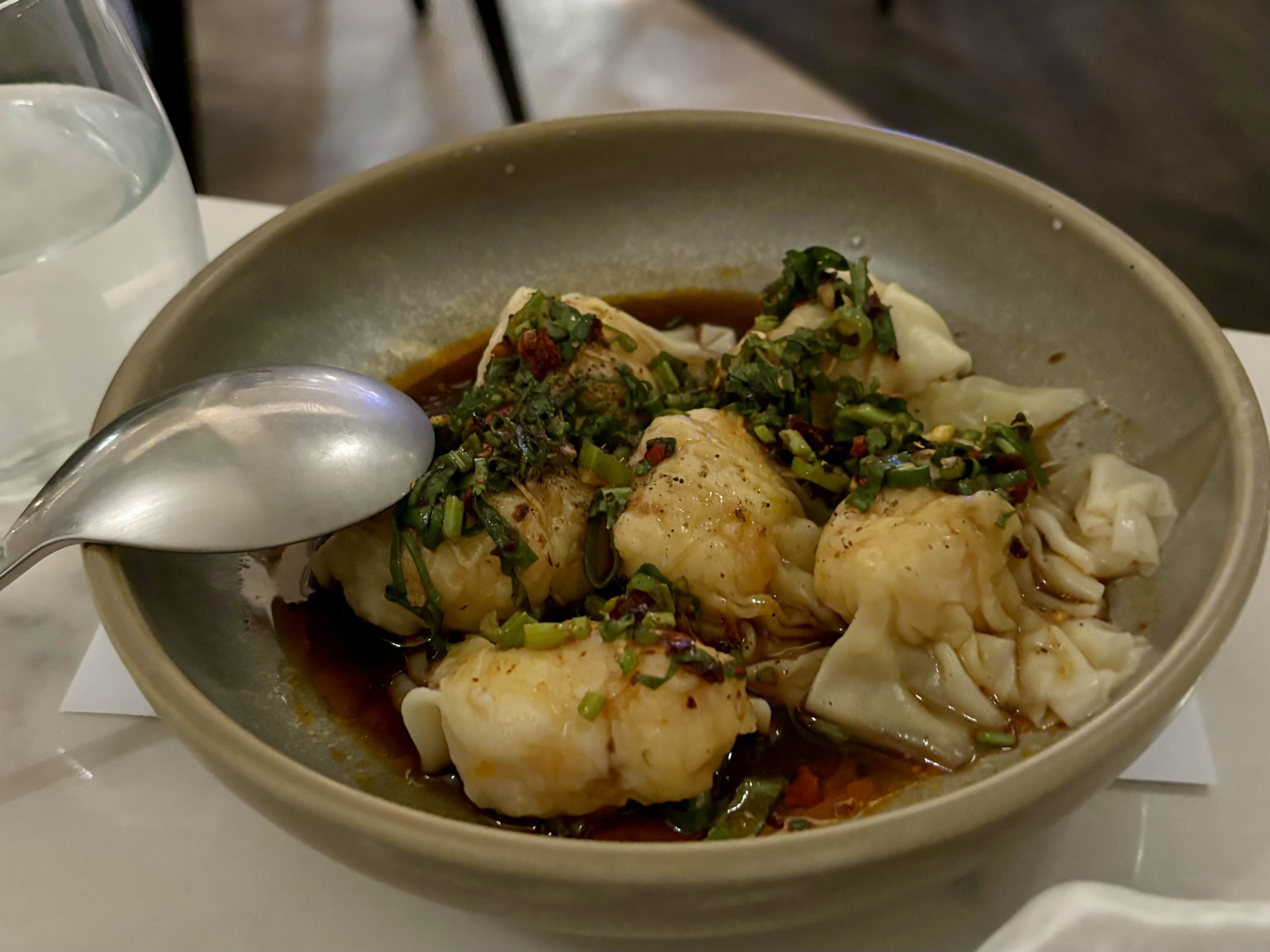 그 다음은 새우+관자 완탕, 사천식 오일+닭고기, 굴소스 언ㄷ은 데친 초이섬, 생선요리 (바라먼디였던거 같은데 정확하지 않음) - 사진이 없음, 챠수돼지고기, 자스민 쌀밥