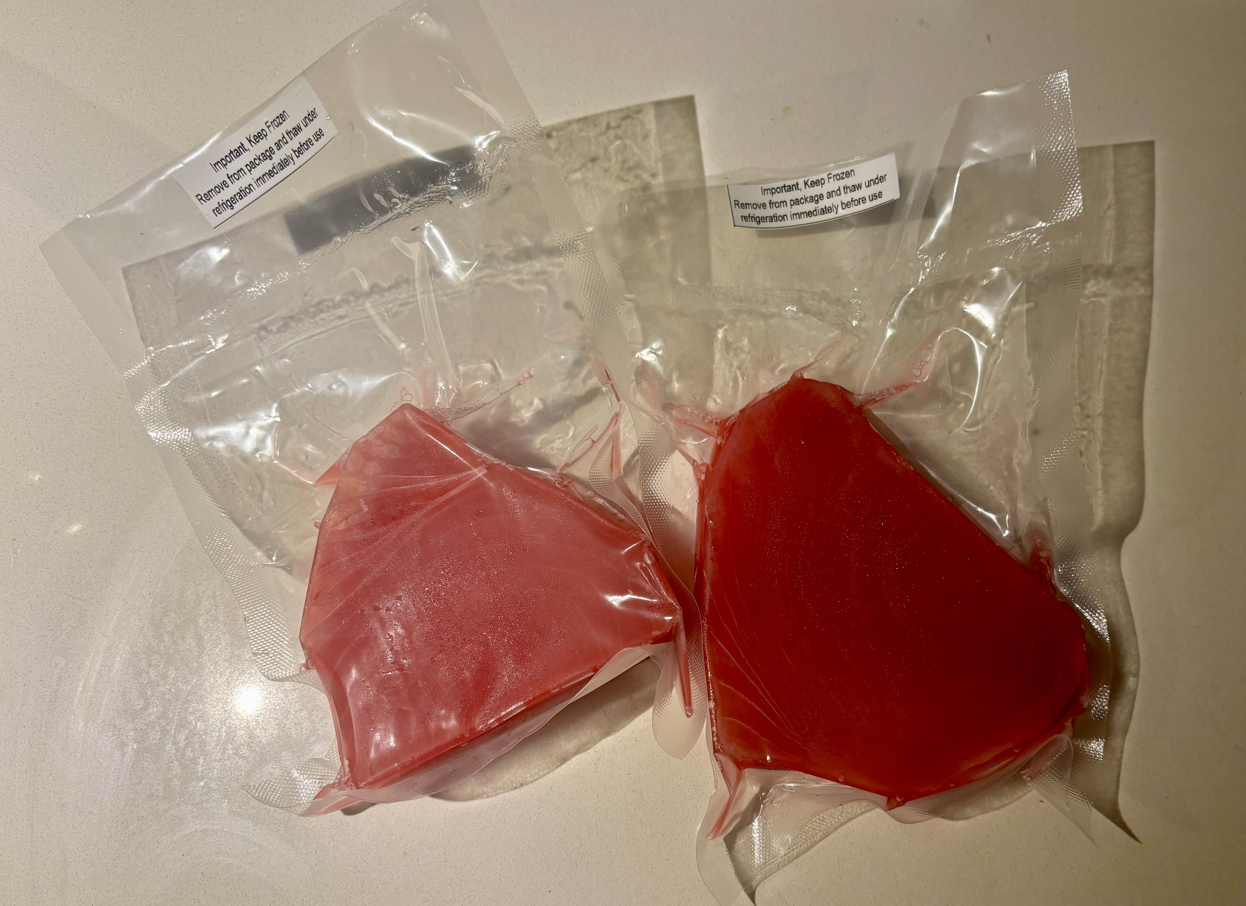 생선가게에서 사올 때는 옅은 핑크색의 같은 종류 참치를 집어온건줄로 알았는데 - 해동을 하고 보니깐 색깔이 조금 다르네.