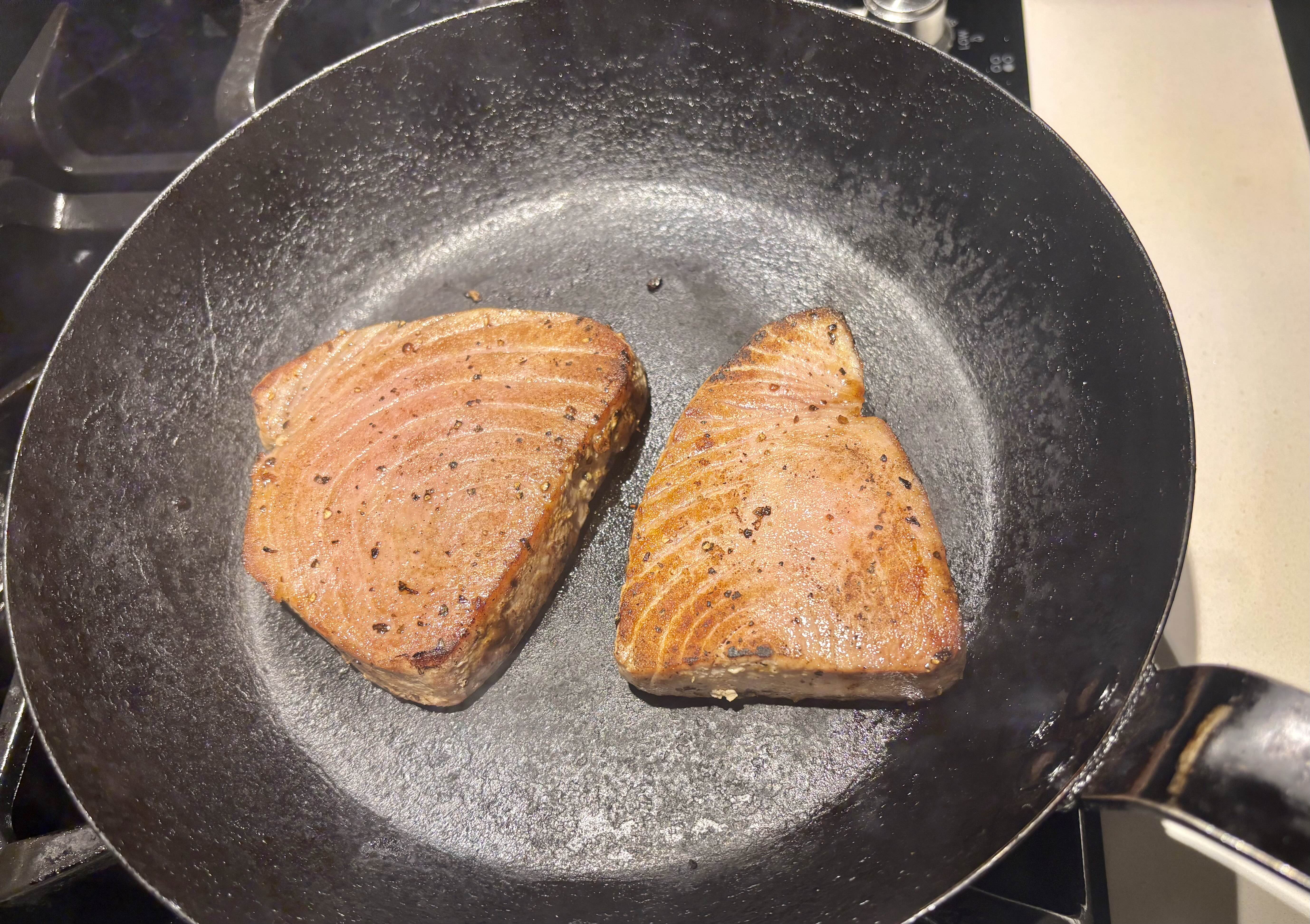 3. 한 면을 90초 --> 뒤집어서 다른 면을 30초 구운 후 -->잠깐 resting 시켰다가 썰어내면 가운데가 익지 않아서 (참치 회 상태) 핑크빛이 도는 참치 스테이크가 된다고 했다.