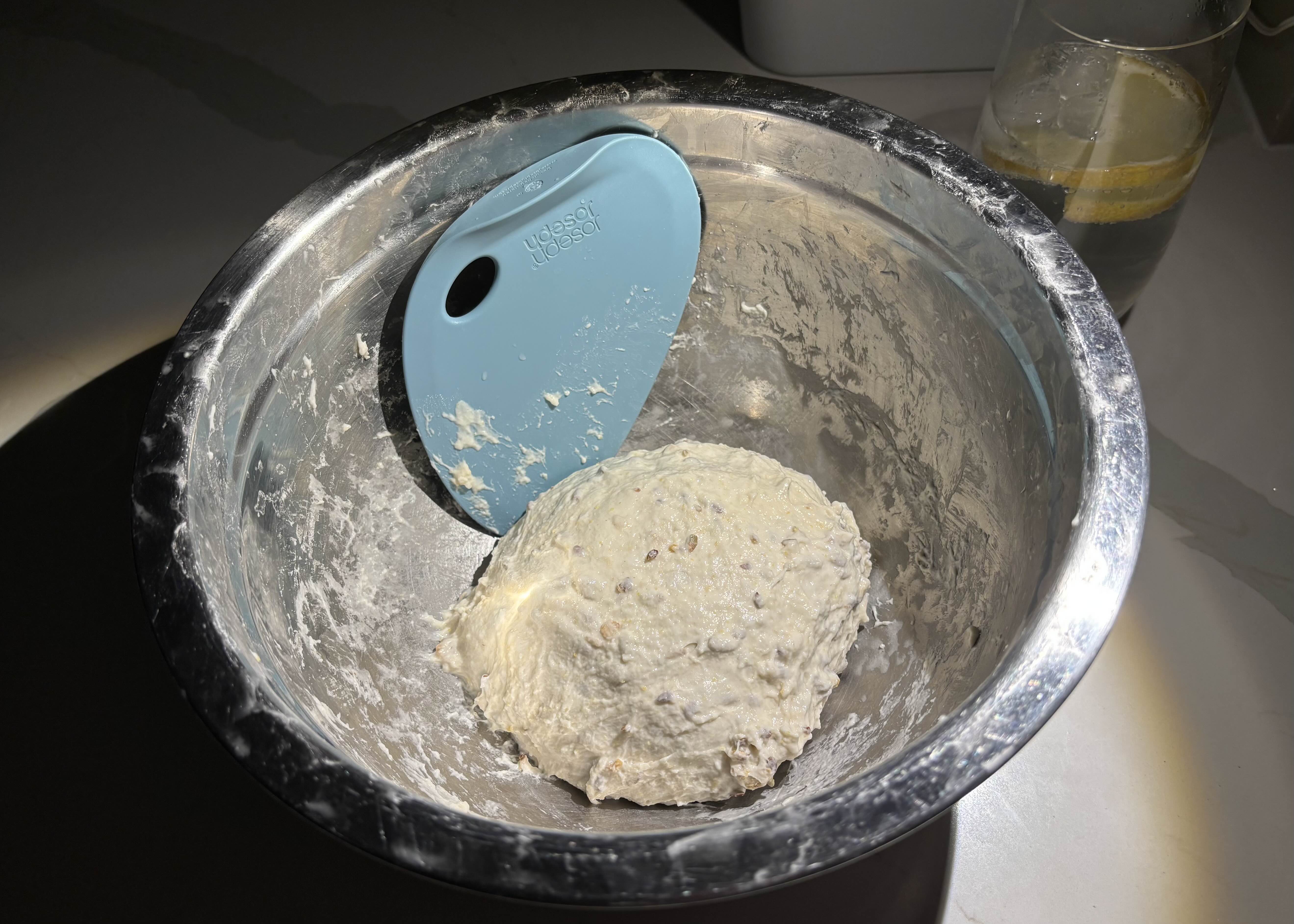 3. 반죽을 평평한 바닥에 올려두고 손으로 만져주어도 되기는 하겠지만, 냉장고에 넣어서 밤새 발효시킬 예정이라서, 볼에 그대로 둔 상태에서 실리콘 스파츌라로 3 분쯤 슥슥 볼 안에서 굴려줌.
