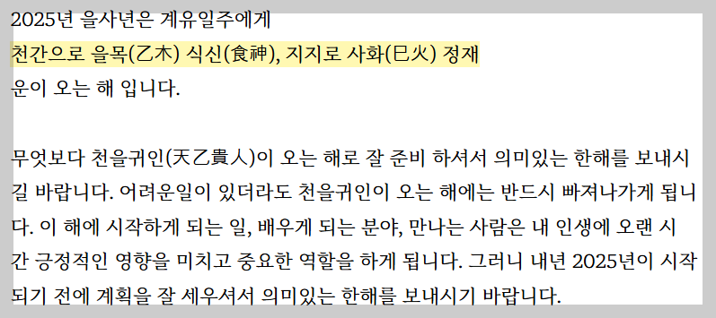 왜 그런지 모르겠는데, 이번 해는 유난히 힘들게 느껴진다. 그래서....2025년 을사년(乙巳年)이 문제인건가.... 하는 생각을 하기에 이르렀다는... 목마른자 우물 판다고... 나의 일주가 뭔지를 찾아보고... 계유일주를 가진 나에게 을사년이 어떤 해인지 좀 찾아보니깐... 이렇게 나온다.