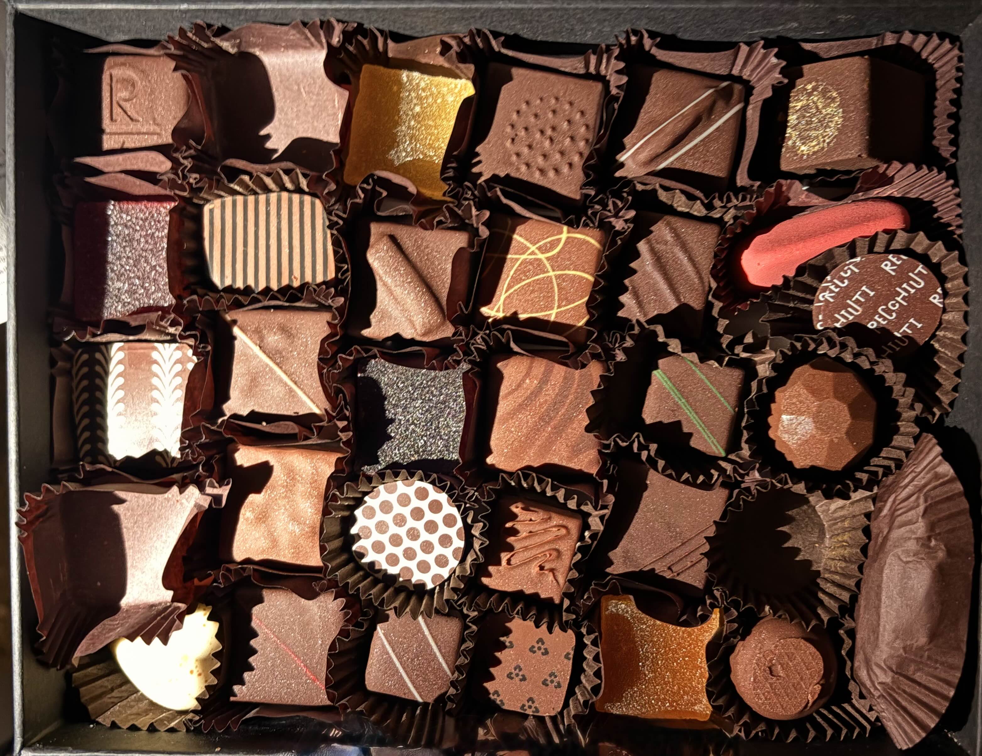 이전에도 수제 초콜렛을 선물해보기도 했는데 - 많은 사람들이 있을 때 개봉해보는건 처음 경험해보았던건가...? 초콜렛과 함께 들어있는 설명서 카탈로그를 보고 - 어떤 맛인지 읽어본 후에, 한개를 고르고 상자를 다음 사람에게 넘김... (고로 1개, 많으면 2개 정도까지 먹음)