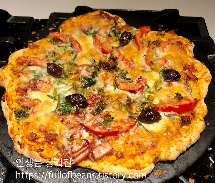 두 번째로는 - 베이컨이랑 치즈, 토마토 그리고 블랙 올리브를 올린 피자다.